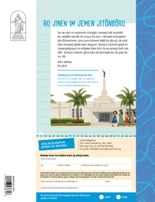 Nobōm̧ba 2022 Ro M̧ōtta RejitōnbōroRiiti ennaan eo kōn rikanaan ro. Ro Jerad kōn MeeļRiiti jet meeļ ko jān ro jerad ipeļaakin laļ in! Kweilo̧k eo Ej n̄an Kwe Pedped ioon Tampeļ eo Nuuj ko an Kweilo̧k Eo Kakeememej ko an Kweilo̧k Eo Kweilo̧k eo ej Kwaļo̧k im Ba Richard M. RomneyDettan eo EjejjetKar kajirere kōn Trina kōn an uddik, bōtaab kūlaaj in Būraimere eo an ej jipan̄ e en̄jake iakwe. Itok, Ļoor Eō Itok, Ļoor Eō M̧akūtkūt koKōjerbal m̧akūtkūt kein n̄an ekkatak Itok, Ļoor Eō ippān baam̧le eo am̧. Kar Lo̧mo̧o̧ren jān KijeekShadrach, Meshach, im Abed-nego kar lo̧mo̧o̧ren jān kijeek eo ke raar kāālet n̄an jar wōt n̄an Anij Kaat in Armej ro Rebun̄bun̄ ilo Jeje Ko RekwojarjarAiin kaat ko n̄an ekkatak kōn armej ro raorōk jān Kallim̧ur M̧okta! Allōn̄ in: Esther im Job. Ļōmņak eo Em̧m̧anJuon peba ekilep kōn ennaan eo, “Ļoor rikanaan eo; e ejeļā iaļ eo.” Daniel im Ro̧n̄ in Ļaiōn eoKōjerbal addi puppet ko n̄an kwaļo̧k bwebwenato eo an Daniel im ro̧n̄ in ļaiōn eo. Jane McBrideJidik Bar Jipan̄Alex ej jook kōn etal n̄an speech therapy, bōtaab ej ekkatak bwe ej EM̧M̧AN n̄an aikuj bar jidik jipan̄. Jeļā Kajjien Carmen jān LebanonJeļā kajjien Carmen jān Lebanon im ekkatak ekōjkan an jipan̄ āinwōt Jisōs. Jisōs Ekar Ba Iakwe Eo RūturidRiiti juon bwebwenato kōn ekōjkan an Jisōs kar katakin kōj n̄an iakwe eo rūturid innām kōm̧m̧ane juon karōk n̄an jipan̄, āinwōt An kar. Iakwe jān Lebanon!Ekkatak kōn Lebanon ippān Margo im Paolo! Jouj ilo Kūlaajruum̧Kōjerbal ļōmņak kein n̄an kaajeded jouj ilo jikuuļ. Kappok Mennin Aorōk an Baam̧leEkkaktak kōn baam̧le eo am̧ im kobaik jet men ko rekāāl n̄an jikin kakoņkoņ mennin aorōk an menmenbwij an baam̧le eo am̧. Pukote!Kwomaron̄ ke kappukōt aitōm ko kar ņooji ilo pija eo? Amie Jane LeavittM̧akūtkūt in Lemlem Peba (Origami)Toshi ej karōk juon m̧akūtkūt n̄an kūlaaj in Būraimere eo an ekāāl ilo Philippines. Gerrit W. GongEkōjkan Aō Maron̄ Jipan̄ Aolep En̄jake Ruwainene?Riiti ennaan eo jān Elder Garrit W. Gong kōn jipan̄ ro jet en̄jake ruwainene. Soccer Riddle eoKōjerbal jipan̄ ko n̄an pukōt etan kajjojo ajri. Matt im MandyMandy ej kōm̧m̧ane juon laajrak in armej ro liin eļap an kam̧m̧oolol kake. N̄an Ajri ro Rōrūttoļo̧k N̄an Ajri ro Rōrūttoļo̧kJipan̄ ko im m̧akūtkūt ko n̄an ajri ro rōrūttoļo̧k. Megan RoxasFelipe Ej Lo Iaļ EoFelipe ej jar n̄an lo iaļ eo ke ekar jōbwābwe im Jemedwōj Ilan̄ ej tōlļo̧k e n̄an kōjparok. M̧aanjabpopo n̄an Tampeļ!Ron̄jake jān ajrii ro ipeļaakin laļ in kōn m̧aanjabpopo n̄an etal n̄an tampeļ. Juon Bwebwenato ippān Xiomara kōn An Kāāl ilo Doulul eo an Jiron̄ roJeļā kajjien Xiomara im ekkatak kōn ekōjkan n̄an em̧m̧akūtļo̧k n̄an Doulul eo an Jiron̄ ro. Tag in Kam̧m̧oololIkkure in kōpōļ doon (tag) kalimomo in n̄an keememej kōjeraam̧m̧an ko am̧! N̄an Ro Jerad Reddik N̄an Ro Jerad ReddikKadedeļo̧k jon̄ak eo an noot ko an al eo. Iakwe, Ro Jera!Ioon jet ro m̧ōtta reddik jān ipeļaakin laļ in. Iien M̧akūtkūtKappukōt m̧ōttan ko rejako an bajōļ eo. Jennifer MaddyJuon Rijipan̄ eo Elem̧ōņōņōFelix ej jipan̄ karreoik m̧weo im̧ōn. Julia WillardsonBok Aorōk eoBernice ej bōk juon bok in jeje ko rekwojarjar aorōk n̄an riiti ippān ro jinen im jemen. Imaron̄ Kōm̧m̧ane Ta Eo Ejim̧we?Katakin ro nejūm̧ reddik kōn peij in kōļar eo an pedped ioon gospel eo. Ennaan eo an allōn̄ in ej, “Imaron̄ kōm̧m̧ane ta eo ejim̧we.” Jisōs Ekar BaJuon peba ekilep kōn ennaan eo, “Jisōs ekar ba Ij aikuj ļoor rikanaan eo.” Iakwe M̧am̧a im Baba ro RejitōnbōroRiiti ennaan eo n̄an ro jinen im jemen kōn kōpooj ajri ro nejimi n̄an jon̄ak ko rekāāl an mour.