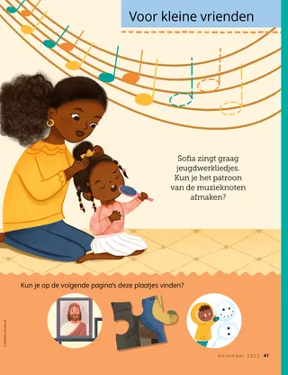 November 2022 Dag vriendjesLees een boodschap over profeten. Post van vriendjesLees post van vriendjes over de hele wereld! De conferentie is voor jou Richt je op de tempel Conferentienieuws Conferentienotities Plaatjes en praatjes over de conferentie Richard M. RomneyPrecies groot genoegTrina wordt geplaagd omdat ze klein is, maar in haar jeugdwerkklas voelt ze zich geliefd. Kom dan en volg Mij Activiteiten Kom dan en volg MijDit zijn extra ideeën voor de wekelijkse leesopdracht in Kom dan en volg Mij – voor personen en gezinnen. Gered van de vuurdoodSadrach, Mesach en Abed-Nego worden van de vuurdood gered wanneer ze ervoor kiezen om tot God te blijven bidden. SchriftheldenkaartjesVerzamel kaartjes om over belangrijke mensen uit het Oude Testament te leren! Deze maand: Esther en Job. Schitterend ideeEen poster met de boodschap: ‘Volg de profeet, want zijn raad is goed.’ Daniël in de leeuwenkuilGebruik deze vingerpoppetjes om het verhaal van Daniël in de leeuwenkuil te vertellen. Jane McBrideEen beetje extra hulpAlex schaamt zich ervoor dat hij naar een logopediste gaat, maar ontdekt dat het helemaal niet erg is als je wat extra hulp nodig hebt. Dit is Carmen uit LibanonMaak kennis met Carmen uit Libanon en kom te weten hoe ze andere mensen helpt zoals Jezus dat deed. Jezus zei dat we onze naasten moeten liefhebbenLees een verhaal over Jezus die ons leerde onze naaste lief te hebben, en maak vervolgens een plan om te helpen, net zoals Hij deed. Groetjes uit Libanon!Kom meer over Libanon te weten met Margo en Paolo! Vriendelijkheid in de klasGebruik deze ideeën om vriendelijkheid op school te verspreiden. FamilieschattenjachtKom meer over je familie te weten en doe iets nieuws in je schatkist voor familiegeschiedenis. Zoeken maar!Kun je de verborgen voorwerpen vinden? Amie Jane LeavittDe origami-activiteitToshi organiseert een activiteit voor zijn jeugdwerkklas op de Filipijnen. Gerrit W. GongHoe kan ik ervoor zorgen dat iedereen zich welkom voelt?Lees hoe we er volgens ouderling Gerrit W. Gong voor kunnen zorgen dat anderen zich welkom voelen. VoetbalraadselGebruik de aanwijzingen om achter de naam van elk kind te komen. Sam en SanneSanne maakt een lijstje met de mensen voor wie ze het dankbaarst is. Voor grote kinderen Voor grote kinderenTips en activiteiten voor grote kinderen. Megan RoxasFelipe vindt de wegFelipe bidt om de weg te vinden wanneer hij verdwaald is, en onze hemelse Vader brengt hem in veiligheid. Maak je klaar voor de tempel!Kinderen over de hele wereld vertellen hoe ze zich voorbereiden om naar de tempel te gaan. Xiomara vertelt hoe het is om naar de jongevrouwen over te gaanMaak kennis met Xiomara en ontdek hoe het is om naar de jongevrouwen over te gaan. DankbaarheidstikkertjeSpeel tikkertje om aan je zegeningen te denken! Voor kleine vrienden Voor kleine vriendenMaak het patroon van de muzieknoten af. Hallo, vrienden!Maak kennis met vriendjes over de hele wereld. Tijd voor een activiteitZoek de ontbrekende stukjes van de puzzel. Jennifer MaddyHelpen met een glimlachFelix helpt bij het opruimen van zijn huis. Julia WillardsonEen bijzonder boekBernice krijgt een bijzonder boek met Schriftuur om met haar ouders te lezen. Ik kan doen wat goed isOnderwijs uw kleintjes met een evangeliegerichte kleurplaat. De boodschap van deze maand is: ‘Ik kan doen wat goed is.’ Jezus zegtEen poster met de boodschap: ‘Jezus zegt dat ik de profeet moet volgen.’ Beste oudersLees een boodschap voor ouders over het voorbereiden van uw kinderen op nieuwe levensfasen.