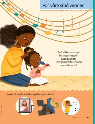 November 2022 Kjære vennerLes et budskap om profeter. Venner via postLes litt post fra våre venner rundt om i verden! Konferansen er for deg Fokuser på tempelet Konferansenyheter Konferansenotater Vis og fortell fra konferansen Richard M. RomneyAkkurat riktig størrelseTrina blir ertet fordi hun er liten, men Primær-klassen hjelper henne å føle seg elsket. Kom, følg med meg Kom, følg med meg-aktiviteterBruk disse aktivitetene til å studere Kom, følg med meg sammen med familien. Reddet fra ildenSjadrak, Mesjak og Abed-Nego blir reddet fra ilden når de velger å fortsette å be til Gud. Kort med helter fra SkrifteneSamle på kort for å lære om viktige personer fra Det gamle testamente! Denne måneden: Ester og Job. En glimrende idéEn plakat med budskapet: “Følg profeten. Han viser vei.” Daniel og løvehulenBruk disse fingerdukkene til å fortelle historien om Daniel og løvehulen. Jane McBrideLitt ekstra hjelpAlex er flau over å gå til taleterapi, men han lærer at det er greit å trenge litt ekstra hjelp. Møt Carmen fra LibanonMøt Carmen fra Libanon, og finn ut hvordan hun hjelper slik Jesus gjorde. Jesus sa at vi skulle elske vår nesteLes en historie om hvordan Jesus lærte oss å elske vår neste og lag en plan for å hjelpe slik han gjorde. Hei fra Libanon!Lær om Libanon sammen med Margo og Paolo! Vennlighet i klasserommetBruk disse forslagene til å spre vennlighet på skolen. FamilieskattejaktLær om familien din, og legg noe nytt i slektshistorie-skattkisten din. Finn den!Kan du finne gjenstandene som er skjult på bildet? Amie Jane LeavittOrigami-aktivitetenToshi planlegger en aktivitet for sin nye Primær-klasse på Filippinene. Gerrit W. GongHvordan kan jeg hjelpe alle å føle seg velkommen?Les et budskap fra eldste Gerrit W. Gong om å hjelpe andre å føle seg velkommen. Fotball-gåteBruk ledetrådene til å finne ut hva hvert barn heter. Matt og MandyMandy lager en liste over dem hun er mest takknemlig for. For eldre barn For eldre barnTips og aktiviteter for eldre barn. Megan RoxasFelipe finner veienFelipe ber om å finne veien når han har gått seg bort, og vår himmelske Fader leder ham i sikkerhet. Gjør deg klar til tempelet!Hør fra barn over hele verden om hvordan de forbereder seg til å dra til tempelet. En samtale med Xiomara om å være ny i Unge kvinnerMøt Xiomara og lær om hvordan det er å gå over til Unge kvinner. TakknemlighetssistenLek denne morsomme leken for å huske dine velsignelser! For våre små venner For våre små vennerGjør ferdig mønsteret med musikknoter. Hei, venner!Møt noen små venner fra forskjellige steder i verden. AktivitetstidFinn de manglende bitene av puslespillet. Jennifer MaddyEn glad hjelperFelix hjelper til med å rydde hjemme. Julia WillardsonDen spesielle bokenBernice får en spesiell skriftstedbok å lese sammen med foreldrene sine. Jeg kan gjøre det retteUndervis de små med en evangeliesentrert fargeleggingsside. Denne månedens budskap er: “Jeg kan gjøre det rette.” Jesus saEn plakat med budskapet: “Jesus sa at jeg skulle følge profeten.” Kjære foreldreLes et budskap til foreldre om å forberede barna til nye stadier av livet.
