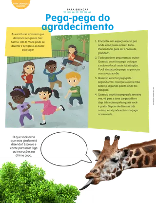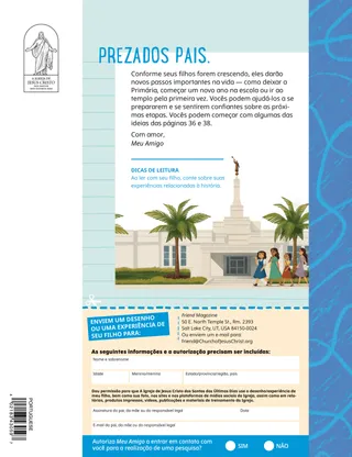 Novembro de 2022 Querido amigoLeia uma mensagem sobre os profetas. Amigos pelo correioLeia algumas cartas de nossos amigos ao redor do mundo! A conferência é para você! Concentrem-se no templo Notícias da conferência Notas da conferência Desenhos e experiências sobre a conferência Richard M. RomneyDo tamanho idealTrina é alvo de zombarias por ser pequena, mas sua classe da Primária a ajuda a se sentir amada. Vem, e Segue-Me Atividades do Vem, e Segue-MeUse estas atividades e ideias para estudar o Vem, e Segue-Me com sua família. Salvos do fogoSadraque, Mesaque e Abede-Nego são salvos do fogo quando decidem continuar orando a Deus. Cartões de heróis das escriturasColecione os cartões para aprender sobre personagens importantes do Velho Testamento! Este mês: Ester e Jó. Ideia brilhanteUm cartaz com a mensagem: “Segue o profeta; não vais errar”. Daniel na cova dos leõesUse estes fantoches de dedo para contar a história de Daniel na cova dos leões. Jane McBrideUma ajudinha a maisAlex está constrangido em precisar de fonoaudiologia, mas descobre que é perfeitamente normal precisar de uma ajudinha a mais. Conheça Carmen, do LíbanoConheça Carmen, do Líbano, e saiba como ela ajuda assim como Jesus. Jesus disse para amarmos nosso próximoLeia uma história sobre como Jesus nos ensinou a amar o próximo e faça um plano para ajudar assim como Ele. Saudações do Líbano!Conheça o Líbano, com Margo e Paolo! Bondade em sala de aulaUse estas ideias para espalhar bondade na escola. Caça ao tesouro em famíliaConheça mais sobre sua família e acrescente algo novo em seu baú do tesouro da história da família. Encontre!Você consegue encontrar os itens escondidos no desenho? Amie Jane LeavittAtividade de origamiToshi organiza uma atividade para sua nova classe da Primária nas Filipinas. Gerrit W. GongComo posso ajudá-los a se sentirem bem-vindos?Leia uma mensagem do élder Gerrit W. Gong sobre ajudar as pessoas a se sentirem bem-vindas. Enigma do futebolUse as pistas para descobrir o nome de cada criança. Matt e MandyMandy faz uma lista das pessoas pelas quais ela sente maior gratidão. Para crianças maiores Para crianças maioresDicas e atividades para crianças maiores. Megan RoxasFelipe encontra o caminhoFelipe ora para encontrar o caminho quando está perdido e o Pai Celestial o conduz em segurança. Prepare-se para ir ao templo!Ouça o que crianças do mundo inteiro têm a dizer sobre como se preparar para ir ao templo. Bate-papo com Xiomara sobre como é entrar para a organização das MoçasConheça Xiomara e descubra como é fazer a transição para as Moças. Pega-pega do agradecimentoFaça este jogo divertido de pega-pega para se lembrar de suas bênçãos! Para os amiguinhos Para os amiguinhosTermine o modelo de notas musicais. Oi, amigos!Conheça alguns amiguinhos ao redor do mundo. AtividadeEncontre as peças que faltam do quebra-cabeça. Jennifer MaddyUm ajudante felizFélix ajuda a limpar sua casa. Julia WillardsonO livro especialBerenice ganha um livro especial das escrituras para ler com os pais. Posso fazer o que é certoEnsine seus filhos pequenos utilizando uma página para colorir cujo tema seja o evangelho. A mensagem deste mês é: “Posso fazer o que é certo”. Jesus disseUm pôster com a mensagem: “Jesus disse que devo seguir o profeta”. Prezados paisLeia uma mensagem para os pais sobre como preparar os filhos para novos estágios na vida.