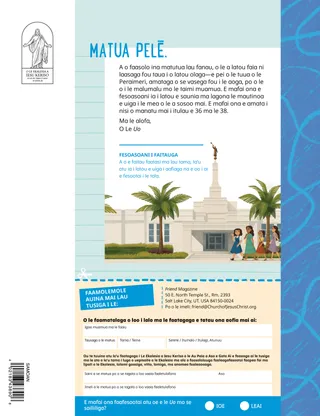 Novema 2022 Uo PeleFaitau se savali e uiga i perofeta. O Uo i le MeliFaitau ni meli mai a tatou uo i le salafa o le lalolagi! O Le Konafesi e mo Oe Taulai Atu i le Malumalu Talafou o le Konafesi Tusigamanatu o le Konafesi O Mea e Faaali ma Faamatala o le Konafesi Richard M. RomneyO Le Telē Sa’o Lava LeaUa ulagia Trina ona o le laitiiti, ae o lana vasega Peraimeri e fesoasoani ia te ia e lagona ai le alofagia. Sau, Mulimuli Mai ia te A’u Gaoioiga o le Sau, Mulimuli Mai ia te A’u Faaaoga nei gaoioiga e suesue ai le Sau, Mulimuli Mai ia te A’u ma lou aiga. Faasaoina mai le AfiE faasaoina Sataraka, Mesako, ma Apeteniko mai le afi ina ua latou filifili e tatalo pea i le Atua. Kata o Toa o Tusitusiga Paia Ao mai ni kata e aoao ai e uiga i tagata taua mai le Feagaiga Tuai! Masina lenei: Eseta ma Iopu. Manatu LeleiO se pepa lautele o i ai se savali, “Mulimuli i le perofeta; na te silafia le ala.” Tanielu ma le Lua o LeonaFaaaoga papeti tamatamailima nei e faamatala ai le tala ia Tanielu ma le lua o leona. Jane McBrideO Sina Fesoasoani FaaopoopoUa matamuli Alex i le alu i se fofo mo le tautala, ae ua ia iloa e le afaina le manaomia o sina fesoasoani faaopoopo. Feiloai ia Carmen mai LepanonaFeiloai ma Carmen mai Lepanona ma aoao pe o faapefea ona ia fesoasoani e pei o Iesu. Fai Mai Iesu ia Alolofa i o Tatou TuaoiFaitau se tala e uiga i le ala na aoao mai ai Iesu ia alolofa i o tatou tuaoi ma faia se fuafuaga e fesoasoani ai, e pei ona sa Ia faia. Talofa mai Lepanona!Aoao e uiga ia Lepanona ma Margo ma Paolo! Agalelei i le PotuaogaFaaaoga nei manatu e faasalalau atu ai le agalelei i le aoga. Sailiga Oa a le AigaAoao e uiga i lou aiga ma faaopoopo se mea fou i lau pusa o oa o talafaasolopito o aiga. Su’e Mai!E mafai ona e sailia mea o loo natia i le ata? Amie Jane LeavittO Le Gaoioiga o le OrikamiUa faatulaga e Toshi se gaoioiga mo lana vasega fou o le Peraimeri i Filipaina. Gerrit W. GongE Faapefea Ona Ou Fesoasoani ia Lagona e Tagata Uma le Tali Leleia?Faitau se savali mai ia Elder Gerrit W. Gong e fesoasoani ai i isi ia lagona le tali leleia. Talataumate i le SokaFaaaoga faaataataga e fuafua ai igoa o tamaiti taitasi. Matt ma MandyUa faia e Mandy se lisi o tagata e sili ona ia faafetai ai. Mo Tamaiti Matutua Mo Tamaiti MatutuaO motugaafa ma gaoioiga mo tamaiti matutua atu. Megan RoxasUa Maua e Felipe le AlaUa tatalo Felipe e saili le ala pe a leiloa o ia ma taialaina o ia e le Tama Faalelagi i le saogalemu. Ia Saunia mo le Malumalu!Faalogo mai tamaiti i le salafa o le lalolagi e uiga i le saunia e o i le malumalu. O Se Talanoaga ma Xiomara e uiga i le Avea ma Se Tagata Fou i Tamaitai TalavouFeiloai ia Xiomara ma aoao e uiga i le tulaga e i ai le suiga i Tamaitai Talavou. Pa’i o le FaafetaiTaalo i le taaloga pa’i malie lenei e manatua ai ou faamanuiaga! Mo Uo Laiti Mo Uo LaitiFaauma le mamanu o nota faamusika. Talofa, Uo!Feiloai atu i nisi o uo laiti mai le salafa o le lalolagi. Taimi o le GaoioigaSaili fasi vaega o loo misi o le paso. Jennifer MaddyO Se Tagata Fesoasoani FiafiaUa fesoasoani Felise e faamama lona fale. Julia WillardsonO Le Tusi FaapitoaUa maua e Bernice se tusi faapitoa o tusitusiga paia e faitau faatasi ma ona matua. E Mafai Ona Ou Faia Le Mea Sa’oIa aoao a outou fanau laiti i se itulau valivali e faatotonugalemu i le talalelei. O le savali o lenei masina o le, “E mafai ona ou faia le mea sa’o.” Sa Fetalai Mai IesuO se pepa lautele o i ai se savali, “Na fetalai mai Iesu e tatau ona ou mulimuli i le perofeta.” Matua PelēFaitau se savali mo matua e uiga i le sauniaina o lau fanau mo ni laasaga fou o le olaga.