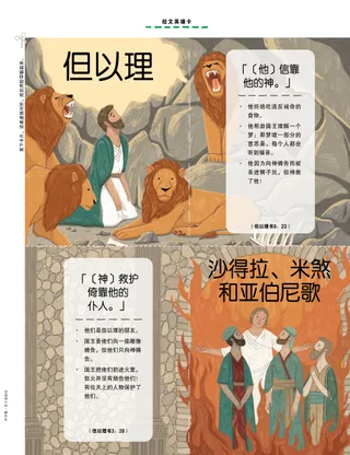 经文英雄卡 剪下卡片,沿着虚线对折,然后用胶带黏起来。 但以理 「〔他〕信靠他的神。」 他拒绝吃违反诫命的食物。 他帮助国王理解一个梦;那梦境一部分的意思是,每个人都会听到福音。 他因为向神祷告而被丢进狮子坑,但神救了他! 沙得拉、米煞和亚伯尼歌 「〔神〕救护倚靠他的仆人。」 他们是但以理的朋友。 国王要他们向一座雕像祷告,但他们只向神祷告。 国王把他们扔进火里,但火并没有烧伤他们!有位天上的人物保护了他们。 阿罗娜·米尔奎姆绘