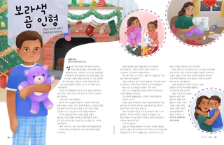 리암은 엄마가 자기 곰 인형을 만드는 데 쓰셨던 보라색 천을 만져 보았어요. 에린 누나의 말이 맞을지도 몰라요. 화려하다고 다 좋은 선물인 건 아니니까요. 리암은 초등회에서 예수님이 가장 위대한 선물이라는 것과, 예수님은 초라한 마구간에서 태어나셨다는 것을 배웠어요.