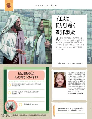 ある夜,ニコデモという人がイエスと話をしました。ニコデモはいくつか質問がありました。ニコデモが質問をする間,イエスはにんたい強くあられました。ニコデモが理解できなかったとき,イエスはもう一度説明されました。