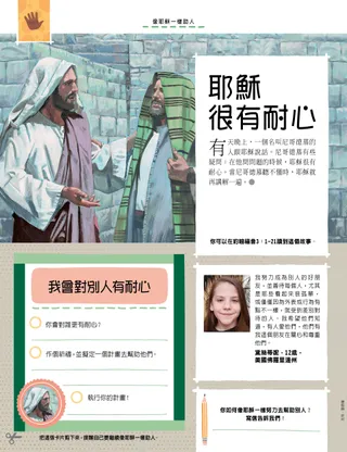 像耶穌一樣助人 耶穌很有耐心 有天晚上,一個名叫尼哥德慕的人跟耶穌說話。尼哥德慕有些疑問;在他問問題的時候,耶穌很有耐心。當尼哥德慕聽不懂時,耶穌就再講解一遍。● 我努力成為別人的好朋友,並善待每個人,尤其是那些看起來很孤單,或僅僅因為外表或行為有點不一樣,就受到差別對待的人。我希望他們知道,有人愛他們,他們有我這個朋友在關心和尊重他們。 黛絲蒂妮,12歲,美國佛羅里達州 瓦特·雷恩繪