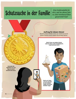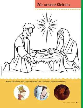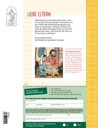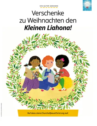 Dezember 2022 Liebe FreundeEine Botschaft darüber, das Licht Jesu Christi zu Weihnachten zu verbreiten Unsere BrieffreundeLeserpost aus aller Welt! Russell M. NelsonDas Licht Jesu Christi verbreitenEine Botschaft von Präsident Russell M. Nelson darüber, wie wir das Licht Jesu Christi verbreiten können Juliann Tenney DomanDer WeihnachtssternCayden möchte im Krippenspiel seiner Familie der Weihnachtsstern sein. Komm und folge mir nach! Aktivitäten zu „Komm und folge mir nach!“Aktivitäten für das gemeinsame Studium der Anleitung „Komm und folge mir nach!“ mit der Familie Die vielen Namen von JesusMehr über die vielen Namen, die in den heiligen Schriften für Jesus Christus verwendet werden Karten zu Heldinnen und Helden aus den SchriftenSammelkarten zu Persönlichkeiten aus dem Alten Testament. Diesen Monat: Daniel und Schadrach, Meschach und Abed-Nego. Mach die Last leichterBei dieser Aktivität erfährst du mehr über die Umkehr. Ein guter GedankeVerschenke den Kleinen Liahona über den Online Store (store.ChurchofJesusChrist.org). María Marta Molina de MonterrosoKekse, Umarmungen und LiebeZu Weihnachten tun Eva und ihre Familie Gutes. Sie backen Kekse für Kinder, die in einer Notunterkunft wohnen. Schatzsuche in der FamilieErfahre mehr über deine Familie und lege etwas Neues in eure Familienschatztruhe. Zeit für den ZehntenEin Spiel zum Zehnten Jun Eui aus HongkongEin Artikel über Jun Eui aus Hongkong, der anderen so hilft, wie Jesus es getan hat Jesus war geduldigEine Geschichte darüber, dass Jesus geduldig war, und die Aufforderung, selbst so zu handeln Hallo aus Hongkong!Lerne mit Margo und Paolo Hongkong kennen! Mikaela WilkinsDer ZehntenkuchenMaya erfährt, warum es wichtig ist, den Zehnten zu zahlen. Charlotte LarcabalSymbole zur WeihnachtszeitMithilfe dieser Seiten kannst du mit deiner Familie eine schöne Weihnachtsaktivität durchführen. Ulisses SoaresWarum sagen wir zu Jesus Christus auch „Erretter“?Eine Botschaft von Elder Ulisses Soares über Jesus Christus SuchbildFindest du die versteckten Gegenstände? Wir folgen Jesus gemeinsamAussagen und Kunstwerke von Kindern aus aller Welt Michelle D. CraigGaben zum WeitergebenEine Botschaft von Schwester Michelle D. Craig über geistige Gaben Tolle TalenteOrdne jedem Kind das richtige Talent zu. Lukas und LeneLukas und Lene erhalten von ihren Freunden Margo und Paolo eine Weihnachtskarte. Für ältere Kinder Für ältere KinderTipps und Aktivitäten für ältere Kinder Lucy Stevenson EwellChieko erfährt von JesusChieko weiß nicht viel über Jesus, aber Missionare in Hawaii erzählen ihr etwas über ihn. Kimberley WarnerDer lila TeddybärZuerst mag Liam sein Weihnachtsgeschenk nicht. Dann erfährt er, dass seine Mutti ihm damit zeigt, wie lieb sie ihn hat. WeihnachtswerkstattProbiere diese Weihnachtsrezepte und -basteleien aus! Danido E.Gute Taten an WeihnachtenDanido E. aus Kambodscha erzählt, wie er zu Weihnachten anderen Gutes getan hat. Für unsere Kleinen Für unsere KleinenMal das Bild von Jesusʼ Geburt aus. Hallo, Freunde!Beiträge von kleinen Kindern aus aller Welt Folg dem SternWelcher Weg führt durch das Labyrinth? Hilf den Sterndeutern, das Jesuskind zu finden! Jennifer MaddyJesus ist geboren!Lies zu Weihnachten die Geschichte von der Geburt Jesu Christi. Jane McBrideDie neue LehrerinAnna ist beunruhigt, weil sie in eine neue PV-Klasse kommt. Doch als sie ihrer neuen Lehrerin helfen kann, freut sie sich. Ich hab Jesus Christus liebUnterweisen Sie Ihr kleines Kind mit einem Ausmalbild zum Evangelium. Die Botschaft für diesen Monat: „Ich hab Jesus Christus lieb.“ Jesus hat gesagtEin Poster mit der Botschaft: „Jesus hat gesagt, dass er für mich zur Erde gekommen ist.“ Liebe Eltern!Einige Worte an die Eltern darüber, wie man zu Weihnachten an Jesus Christus denken kann