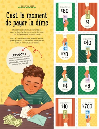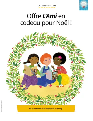 Décembre 2022 Cher amiLis un message sur la manière de répandre la lumière du Christ ce Noël. Amis par courrierLis le courrier de nos amis du monde entier ! Russell M. NelsonRépandre la lumière de Jésus-ChristLis un message de Russell M. Nelson sur le fait de répandre la lumière de Jésus-Christ. Juliann Tenney DomanL’étoile de la NativitéCayden veut être l’étoile de Noël dans la scène de la Nativité de sa famille. Viens et suis-moi Activités du programme Viens et suis-moiUtilise ces activités pour étudier Viens et suis-moi avec ta famille. Les nombreux noms de JésusDécouvre les nombreux noms de Jésus-Christ qui sont utilisés dans les Écritures. Cartes des héros des ÉcrituresCollectionne des cartes pour en savoir plus sur des personnes importantes de l’Ancien Testament ! Ce mois-ci : Daniel et Schadrac, Méschac et Abed-nego Alléger ta chargeFais cette activité pour en savoir plus sur le repentir. Une idée brillanteFais connaître L’Ami en allant sur store.ChurchofJesusChrist.org. María Marta Molina de MonterrosoBiscuits, câlins et amourEva et sa famille rendent service à Noël en confectionnant des biscuits pour les enfants qui habitent dans un refuge. Chasse au trésor familialeApprends-en davantage sur ta famille et ajoute quelque chose de nouveau à ta boîte aux trésors d’histoire familiale. C’est le moment de payer la dîmeJoue à un jeu d’associations sur la dîme. Fais la connaissance de Jun Eui, de Hong KongFais la connaissance de Jun Eui, de Hong Kong, et découvre comment il aide à la manière de Jésus. Jésus était patientDécouvre comment Jésus a été patient puis fais un plan pour aider, comme il le faisait. Bonjour de Hong Kong !Découvre Hong Kong avec Margo et Paolo ! Mikaela WilkinsLa tarte de la dîmeMaya découvre pourquoi il est important de payer la dîme. Charlotte LarcabalLes symboles de NoëlUtilise ces pages pour faire une activité de Noël spéciale avec ta famille. Ulisses SoaresPourquoi appelons-nous Jésus-Christ le Sauveur ?Lis un message d’Ulisses Soares sur Jésus-Christ. Trouve-les !Trouveras-tu les objets cachés dans cette image ? Suivre Jésus ensembleMessages et créations d’enfants du monde entier. Michelle D. CraigDons à montrerLis un message de Michelle D. Craig sur les dons spirituels. Jeu de paires des talentsAssocie chaque enfant au talent qu’il a. Matt et MandyMatt et Mandy reçoivent une carte de Noël de leurs amis Margo et Paolo. Pour les enfants plus âgés Pour les enfants plus âgésConseils et activités pour les enfants plus âgés. Lucy Stevenson EwellChieko apprend à connaître JésusChieko ne sait pas grand-chose de Jésus, mais elle apprend à le connaître grâce aux missionnaires à Hawaï. Kimberley WarnerL’ours en peluche violetAu début, Liam n’aimait pas son cadeau de Noël. Puis il a appris qu’il représente à quel point sa mère l’aime. Atelier de NoëlEssaye ces recettes de Noël et ces travaux manuels ! Danido E.Rendre service à NoëlDanido E., du Cambodge, raconte comment il a rendu service à Noël. Pour les tout-petits Pour les tout-petitsColorie l’image de la crèche. Bonjour les amis !Rencontre des jeunes amis du monde entier. Suis l’étoileSuis le bon chemin à travers le labyrinthe pour aider les rois mages à trouver l’enfant Jésus. Jennifer MaddyJésus est né !Pour Noël, lis l’histoire de la naissance de Jésus-Christ. Jane McBrideLa nouvelle instructriceAnna est nerveuse à l’idée d’aller dans sa nouvelle classe de Primaire, mais elle est heureuse quand elle aide son instructrice. J’aime Jésus-ChristInstruisez vos tout-petits à l’aide d’un coloriage basé sur l’Évangile. Le message de ce mois-ci est : « J’aime Jésus-Christ. » Jésus a ditUne affiche avec le message : « Jésus a dit qu’il est venu sur terre pour moi. » Chers ParentsLisez un message destiné aux parents sur la manière de se souvenir de Jésus-Christ à Noël.