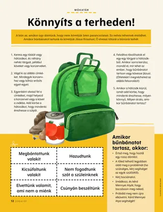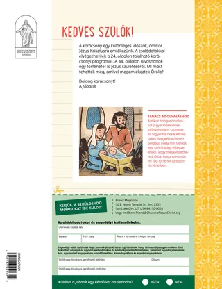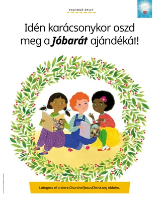 2022. december Kedves jóbarátok!Olvass el egy üzenetet Krisztus világosságának a megosztásáról idén karácsonykor. Levelező jóbarátokOlvasd el jóbarátaink leveleit szerte a világból! Russell M. NelsonJézus Krisztus világosságának a megosztásaOlvasd el Russell M. Nelson elnök üzenetét Jézus Krisztus világosságának a megosztásáról. Juliann Tenney DomanA betlehemi csillagKristóf karácsonyi csillag szeretne lenni a családi betlehemes darabban. Jöjj, kövess engem! Jöjj, kövess engem! tevékenységekHasználjátok ezeket a tevékenységeket a Jöjj, kövess engem! családi tanulmányozásához. Jézus sokféle neveOlvasd el, milyen sok nevet használnak a szentírások Jézus Krisztusra. Szentírások hősei kártyákGyűjtsd a kártyákat, és tanulj az Ószövetség meghatározó személyiségeiről! Ebben a hónapban: Dániel, valamint Sidrák, Misák és Abednégó Könnyíts a terheden!Próbáld ki ezt a tevékenységet, és tanulj a bűnbánatról. Ragyogó ötletOszd meg a Jóbarátot azáltal, hogy ellátogatsz a store.ChurchofJesusChrist.org honlapra. María Marta Molina de MonterrosoSütik, ölelések és szeretetEva és a családja úgy szolgál karácsonykor, hogy sütit készítenek a óvóhelyen tartózkodó gyermekeknek. Családi kincskeresőTanulj a családtörténetedről, és tegyél valami újat a családtörténeti kincsesládikádba! TizedfizetésJátssz a tizedhez kapcsolódó párosító játékot. Ő Csün-jí HongkongbólIsmerd meg Csün-jít Hongkongból, és tudd meg, hogyan segít úgy, ahogy azt Jézus tette. Jézus türelmes voltOlvass el egy történetet arról, hogy mi módon volt Jézus türelmes, majd tervezd meg, te miként fogsz úgy segíteni, ahogy azt Ő tette. Üdvözlet Hongkongból!Tanulj Hongkongról Margóval és Paolóval. Mikaela WilkinsA tizedtortaMaja megtudja, miért fontos tizedet fizetni. Charlotte LarcabalA karácsony jelképeiHasználd ezeket az oldalakat egy különleges karácsonyi tevékenységre a családoddal. Ulisses SoaresMiért nevezzük Jézus Krisztust a Szabadítónak?Olvasd el Ulisses Soares elder üzenetét Jézus Krisztusról. Találd meg!Megtalálod a képen az elrejtett tárgyakat? Együtt követni JézustGyermekektől származó idézetek gyűjteménye szerte a világból. Michelle D. CraigMegosztani való ajándékokOlvass el egy üzenetet Michelle D. Craig nővértől a lelki ajándékokról. TehetségpárosítóPárosítsd össze mindegyik gyermeket a tehetségével. Máté és MettiMáté és Metti karácsonyi üdvözlőlapot kapnak a barátaiktól, Margótól és Paolótól. Nagyobb gyermekeknek Nagyobb gyermekeknekTippek és tevékenységek nagyobb gyermekeknek. Lucy Stevenson EwellChieko Jézusról tanulChieko nem sokat tud Jézusról, de a Hawaiin szolgáló misszionáriusoktól tanul Róla. Kimberley WarnerA lila plüssmackóLiamnek eleinte nem tetszik a karácsonyi ajándéka. Aztán rájön, hogy az annak a jele, mennyire szereti őt az anyukája. Karácsonyi barkácsolásPróbáljátok ki ezeket a karácsonyi recepteket és kézműves ötleteket! Danido E.Karácsonyi szolgálatDanido E. Kambodzsából elmeséli, hogyan szolgált másokat karácsonykor. Kis barátoknak Kis barátoknakSzínezd ki a Jézus születését ábrázoló képet! Sziasztok, jóbarátok!Ismerkedj meg néhány kis baráttal szerte a világból. Kövesd a csillagot!Kövesd a helyes ösvényt az útvesztőben, hogy segíts a napkeleti bölcseknek megtalálni a kisded Jézust. Jennifer MaddyJézus megszületett!Karácsonyra olvasd el Jézus Krisztus születésének a történetét. Jane McBrideAz új tanítóAnna nagyon izgul az új elemis osztálya miatt, de boldog, amikor segíthet a tanítójának. Szeretem Jézus KrisztustTanítsd a kisgyermekeidet evangéliumközpontú színezővel! Az e havi üzenet: Szeretem Jézus Krisztust. Jézus mondtaEgy poszter ezzel az üzenettel: Jézus azt mondta, hogy értem jött a földre. Kedves Szülők!Olvass el egy üzenetet a szülőknek arról, hogyan emlékezhetnek meg Jézus Krisztusról karácsonykor.
