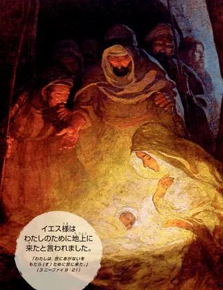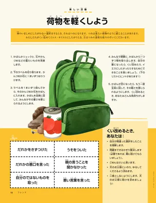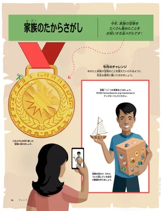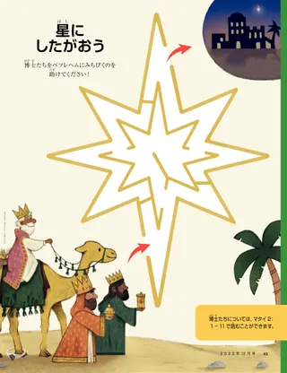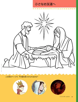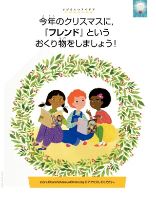 2022年12月号 愛するフレンド(お友達)のみなさん今年のクリスマスにキリストの光を分かち合うことについてのメッセージを読みましょう。 お友達からのお便り世界各地のお友達からのお便りをしょうかいします! ラッセル・M・ネルソンイエス・キリストの光を分かち合うラッセル・M・ネルソン大管長からの,イエス・キリストの光を分かち合うことについてのメッセージを読みましょう。 ジュリアン・テニー・ドーマンこうたんげきの星ケイデンは,家族のキリストこうたんげきでクリスマスの星になりたいと思います。 『わたしにしたがってきなさい』 『わたしにしたがってきなさい』の活動これらの活動を使って『わたしにしたがってきなさい』を家族で研究しましょう。 イエスのいろいろな名前聖文で使われているイエス・キリストのいろいろな名前について読みましょう。 聖文ヒーローカードカードを集めて,旧約聖書の重要な人たちについて学びましょう!今月:ダニエル,シャデラク,メシャク,アベデネゴ 荷物を軽くしようこの活動をして,くい改めについて学びましょう。 すばらしいアイデアstore.ChurchofJesusChrist.orgにアクセスして『フレンド』を分かち合いましょう。 マリア・マルタ・モリーナ・デ・モンテローソクッキーとハグと愛クリスマスに,エバは家族と一緒に,ひなん所にいる子供たちのためにクッキーを作って奉仕します。 家族のたからさがし家族について学び,家族れきしの宝箱に新しいものを加えましょう。 什分の一の時間什分の一の絵合わせゲームで遊びましょう。 香港のジュンイをしょうかいします香港のジュンイをしょうかいします。ジュンイがどのようにしてイエスのように人を助けているか見てみましょう。 イエスはにんたい強くあられましたイエスがどのようににんたい強くあられたかについての話を読み,イエスのように人を助けるための計画を立てましょう。 香港からこんにちは!マルゴとパオロと一緒に,香港について学びましょう! ミカエラ・ウィルキンス什分の一のパイマヤが,什分の一をおさめることが大切である理由について学びます。 シャーロット・ラーカバルクリスマスのしょうちょうこのページを使って,家族と一緒に特別なクリスマスの活動をしましょう。 ウリセス・ソアレスわたしたちはなぜイエス・キリストをすくい主とよぶのでしょうか?ウリセス・ソアレス長老からの,イエス・キリストについてのメッセージを読みましょう。 見つけよう!絵の中にかくれているものを見つけられますか? ともにイエスにしたがう世界中から集まった子供たちの言葉。 ミッシェル・D・クレーグ賜物は分かち合うために霊的な賜物について,ミッシェル・D・クレーグ姉妹のメッセージを読みましょう。 才能マッチングそれぞれの子供を,その子の才能と結びましょう。 マットとマンディマットとマンディが,友達のマルゴとパオロからクリスマスカードを受け取ります。 年長の子供たちへ 年長の子供たちへ年長の子供たちのためのヒントと活動。 ルーシー・スティーブンソン・イーウェルイエスについて学ぶチエコチエコはイエスについてあまりよく知りませんでしたが,ハワイで宣教師からイエスについて学びます。 キンバリー・ワーナーむらさき色のクマのぬいぐるみ最初,リアムは自分がもらったクリスマスプレゼントが気に入りませんでした。けれどもその後,そのプレゼントが,お母さんが自分をとても愛してくれていることのしるしだと知ります。 クリスマスの手作り工房クリスマスのレシピや工作に挑戦してみましょう! ダニード・Eクリスマスの奉仕カンボジアのダニード・Eが,クリスマスにどのように人々に奉仕したかを分かち合います。 小さなお友達へ 小さなお友達へキリストのこうたんの場面の絵に色をぬりましょう。 やあ,フレンドのみんな!世界各地の小さなフレンドたちをしょうかいします。 星にしたがおう迷路の正しい道をたどって,博士たちが幼子イエスを見つけるのを助けましょう。 ジェニファー・マディーイエスがお生まれになりました!クリスマスにイエス・キリストのこうたんの物語を読みましょう。 ジェーン・マクブライド新しい先生アンナは新しい初等協会のクラスのことで不安になりますが,先生を助けることで気持ちが軽くなります。 わたしはイエス・キリストを愛しています福音を中心にしたぬり絵ページを使って,小さな子供たちを教えましょう。今月のメッセージは,「わたしはイエス・キリストを愛しています」です。 イエスは言われました「イエス様はわたしのために地上に来たと言われました」というメッセージが書かれたポスター。 親愛なる親の皆さんクリスマスにイエス・キリストを思い起こすことについて,親へのメッセージをお読みください。