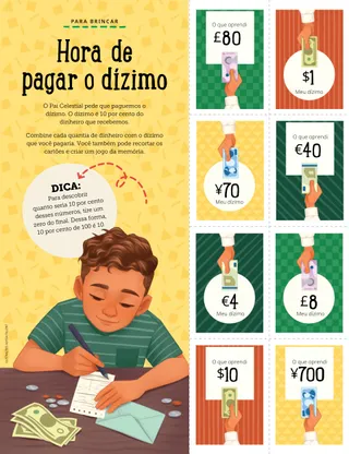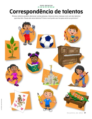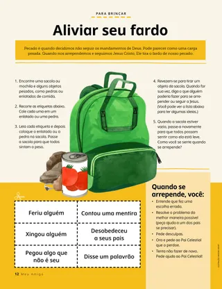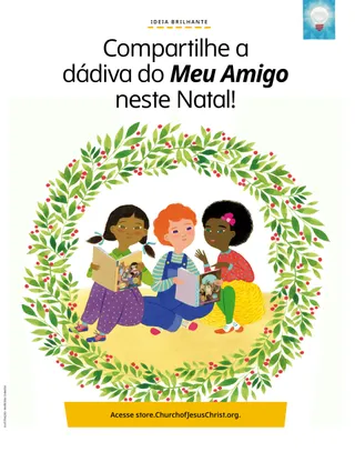 Dezembro de 2022 Querido amigoLeia uma mensagem sobre compartilhar a Luz de Cristo neste Natal. Amigos pelo correioLeia algumas cartas de nossos amigos ao redor do mundo! Russell M. NelsonCompartilhar a Luz de Jesus CristoLeia uma mensagem do presidente Russell M. Nelson sobre compartilhar a Luz de Jesus Cristo. Juliann Tenney DomanA estrela do nascimento de Jesus CristoCayden quer ser a estrela do Natal na peça de sua família sobre o nascimento de Jesus Cristo. Vem, e Segue-Me Atividades do Vem, e Segue-MeUse estas atividades e ideias para estudar o Vem, e Segue-Me com sua família. Os vários nomes de JesusLeia sobre os vários nomes de Jesus Cristo que são usados nas escrituras. Cartões de heróis das escriturasColecione os cartões para aprender sobre personagens importantes do Velho Testamento! Este mês: Daniel, Sadraque, Mesaque e Abede-Nego Aliviar seu fardoFaça esta atividade para aprender sobre o arrependimento. Ideia brilhanteCompartilhe o Meu Amigo ao acessar store.ChurchofJesusChrist.org. María Marta Molina de MonterrosoBiscoitos, abraços e amorEva e sua família servem no Natal fazendo biscoitos para as crianças que estão em um abrigo. Caça ao tesouro em famíliaConheça mais sobre sua família e acrescente algo novo em seu baú do tesouro de história da família. Hora de pagar o dízimoJogue um jogo da memória do dízimo. Conheça Jun Eui, de Hong KongConheça Jun Eui, de Hong Kong, e saiba como ele ajuda as pessoas, assim como Jesus. Jesus era pacienteLeia uma história sobre como Jesus era paciente, e depois faça um plano para ajudar as pessoas, assim como Ele. Saudações de Hong Kong!Aprenda sobre Hong Kong, com Margo e Paolo! Mikaela WilkinsTorta do dízimoMaia aprende por que é importante pagar o dízimo. Charlotte LarcabalOs símbolos do NatalUse estas páginas para fazer uma atividade especial de Natal com sua família. Ulisses SoaresPor que chamamos Jesus Cristo de Salvador?Leia uma mensagem do élder Ulisses Soares sobre Jesus Cristo. Encontre!Você consegue encontrar os itens escondidos no desenho? Juntos seguindo a JesusUma coletânea de citações e desenhos de crianças de todo o mundo. Michelle D. CraigDons para compartilharLeia uma mensagem da irmã Michelle D. Craig sobre dons espirituais. Correspondência de talentosAssocie cada criança com o talento que ela tem. Matt e MandyMatt e Mandy receberam um cartão de Natal de seus amigos Margo e Paolo. Para crianças maiores Para crianças maioresDicas e atividades para as crianças maiores. Lucy Stevenson EwellChieko aprende sobre JesusChieko não sabe muito sobre Jesus, mas ela aprende sobre Ele com os missionários do Havaí. Kimberley WarnerO urso roxoA princípio, Liam não gosta de seu presente de Natal. Depois, ele aprende que isso mostra o quanto sua mãe o ama. Curso de NatalExperimente essas receitas de Natal e esses artesanatos! Danido E.Serviço ao próximo no NatalDanido E., do Camboja, conta como serviu ao próximo no Natal. Para os amiguinhos Para os amiguinhosPinte esta gravura da Natividade. Oi, amigos!Conheça alguns amiguinhos ao redor do mundo. Siga a estrelaSiga o caminho certo pelo labirinto para ajudar os magos a encontrar o menino Jesus. Jennifer MaddyJesus nasceu!Leia a história do nascimento de Jesus Cristo no Natal. Jane McBrideO novo professorAnna está nervosa em relação a sua nova classe da Primária, mas fica feliz quando ajuda a professora. Amo Jesus CristoEnsine seus filhos pequenos utilizando uma página para colorir cujo tema seja o evangelho. Neste mês, a mensagem é “Amo Jesus Cristo”. Jesus disseUm cartaz com a mensagem: “Jesus disse que veio à Terra por mim”. Queridos paisLeia uma mensagem para os pais sobre lembrar-se de Jesus Cristo no Natal.