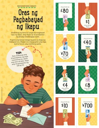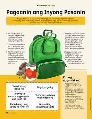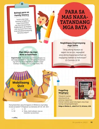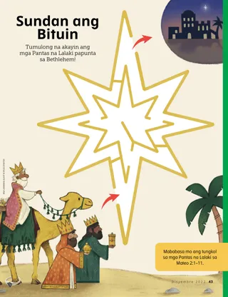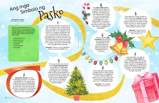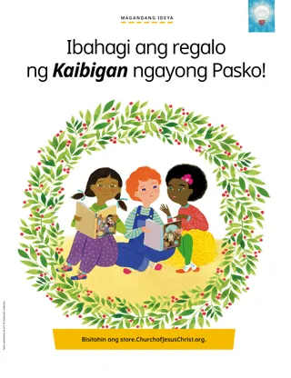 Disyembre 2022 Minamahal na mga KaibiganBasahin ang isang mensahe tungkol sa pagbabahagi ng Liwanag ni Cristo ngayong Pasko. Mga Kaibigan sa KoreoBasahin ang ilang sulat mula sa ating mga kaibigan sa buong mundo! Russell M. NelsonPagbabahagi ng Liwanag ni CristoBasahin ang isang mensahe mula kay Pangulong Russell M. Nelson tungkol sa pagbabahagi ng liwanag ni Jesucristo. Juliann Tenney DomanAng Nativity StarGusto ni Cayden na maging Christmas star sa dula-dulaan ng kanyang pamilya tungkol sa Nativity. Pumarito Ka, Sumunod Ka sa Akin Mga Aktibidad para sa Pumarito Ka, Sumunod Ka sa AkinGamitin ang mga aktibidad na ito para pag-aralan ang Pumarito Ka, Sumunod Ka sa Akin kasama ang inyong pamilya. Ang Maraming Pangalan ni JesusBasahin ang tungkol sa maraming pangalan ni Jesucristo na ginagamit sa mga banal na kasulatan. Mga Kard tungkol sa mga Bayani sa Banal na KasulatanKolektahin ang mga kard para malaman ang tungkol sa mahahalagang tao mula sa Lumang Tipan! Sa buwang ito: Daniel at Shadrac, Meshac, at Abednego Pagaanin ang Inyong PasaninGawin ang aktibidad na ito para matuto tungkol sa pagsisisi. Magandang IdeyaIbahagi ang Kaibigan sa pamamagitan ng pagbisita sa store.ChurchofJesusChrist.org. María Marta Molina de MonterrosoCookies, mga Yakap, at PagmamahalNaglingkod si Eva at ang kanyang pamilya sa Pasko sa pamamagitan ng paggawa ng cookies para sa mga batang nananatili sa bahay-ampunan. Treasure Hunt ng PamilyaAlamin ang tungkol sa iyong pamilya at magdagdag ng bago sa iyong family history treasure box. Oras ng Pagbabayad ng IkapuMaglaro ng tithing matching game. Kilalanin si Jun Eui na Taga-Hong KongKilalanin si Jun Eui na taga-Hong Kong at alamin kung paano siya tumutulong na tulad ni Jesus. Matiyaga si JesusBasahin ang isang kuwento kung paano nagtiyaga si Jesus at pagkatapos ay magplanong tumulong, tulad ng ginawa Niya. Hello mula sa Hong Kong!Alamin ang tungkol sa Hong Kong kasama sina Margo at Paolo! Mikaela WilkinsTithing PieNalaman ni Maya kung bakit mahalagang magbayad ng ikapu. Charlotte LarcabalAng mga Simbolo ng PaskoGamitin ang mga pahinang ito para gawin ang isang espesyal na aktibidad sa Pasko kasama ang inyong pamilya. Ulisses SoaresBakit Natin Tinatawag na Tagapagligtas si Jesucristo?Basahin ang isang mensahe mula kay Elder Ulisses Soares tungkol kay Jesucristo. Hanapin Ito!Mahahanap mo ba ang mga bagay na nakatago sa larawan? Magkakasamang Sumusunod kay JesusIsang koleksyon ng mga sinabi ng mga bata mula sa iba’t ibang panig ng mundo. Michelle D. CraigMga Regalong MaibabahagiBasahin ang isang mensahe mula kay Sister Michelle D. Craig tungkol sa mga espirituwal na kaloob. Pagtutugma ng TalentoItugma ang bawat bata sa talento nila. Matt at MandyNakatanggap ng Christmas card sina Matt at Mandy mula sa mga kaibigan nilang sina Margo at Paolo. Para sa Mas Nakatatandang mga Bata Para sa Mas Nakatatandang mga BataMga tip at aktibidad para sa mas nakatatandang mga bata. Lucy Stevenson EwellNalaman ni Chieko ang Tungkol kay JesusWalang gaanong alam si Chieko tungkol kay Jesus, pero nalaman niya ang tungkol sa Kanya mula sa mga missionary sa Hawaii. Kimberley WarnerAng Teddy Bear na Kulay-UbeNoong una, hindi gusto ni Liam ang regalo sa kanya sa Pasko. Pagkatapos ay nalaman niya na ipinapakita nito kung gaano siya kamahal ng kanyang ina. Workshop sa PaskoSubukan ang mga resipe at craft na ito sa Pasko! Danido E.Paglilingkod sa Araw ng PaskoIbinahagi ni Danido E. na taga-Cambodia kung paano niya pinaglingkuran ang iba sa araw ng Pasko. Para sa Maliliit na Kaibigan Para sa Maliliit na KaibiganKulayan ang larawang ito ng Nativity. Hello, mga Kaibigan!Kilalanin ang ilang maliliit na kaibigan mula sa iba’t ibang panig ng mundo. Sundan ang BituinSundan ang tamang landas sa maze para tulungan ang mga Pantas na Lalaki na matagpuan ang sanggol na si Jesus. Jennifer MaddyIsinilang si Jesus!Basahin ang kuwento ng pagsilang ni Jesucristo para sa Pasko. Jane McBrideAng Bagong GuroKinakabahan si Anna sa bago niyang klase sa Primary, pero masaya siya kapag tinutulungan niya ang kanyang guro. Mahal Ko si Jesucristo.Turuan ang inyong mga musmos gamit ang isang pahinang kukulayan na nakasentro sa ebanghelyo. Ang mensahe sa buwang ito ay, “Mahal ko si Jesucristo.” Sinabi ni JesusIsang poster na may mensaheng, “Sinabi ni Jesus na pumarito Siya sa lupa para sa akin.” Minamahal na mga MagulangBasahin ang isang mensahe para sa mga magulang tungkol sa pag-alaala kay Jesucristo sa Pasko.