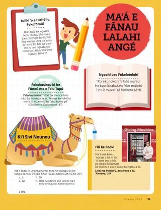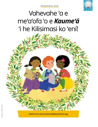 Tīsema 2022 Si‘i Ngaahi KaungāmeʻaLau ha pōpoaki fekauʻaki mo hono vahevahe ʻo e Maama ʻo Kalaisí ʻi he Kilisimasi ko ʻení. Ngaahi Kaungāmeʻa ʻi he MeilíLau ha meili mei hotau ngaahi kaungāmeʻa ʻi he funga ʻo e māmaní! Russell M. NelsonKo Hono Vahevahe e Maama ʻo Sīsū KalaisíLau ha pōpoaki meia Palesiteni Lāsolo M. Nalesoni fekauʻaki mo hono vahevahe e Maama ʻo Sīsū Kalaisí. Suliana Teni TōmeniKo e Fetuʻu ʻo e ʻAloʻíʻOku loto ʻa Keiteni ke hoko ko e fetuʻu ʻo e Kilisimasí ʻi he tulama ʻAloʻi ʻo hono fāmilí. Haʻu, ʻo Muimui ʻIate Au Ngaahi ʻEkitivitī ʻi heHaʻu, ʻo Muimui ʻIate Aú Fakaʻaongaʻi ʻa e ngaahi ʻekitivitī ko ʻení ki hono ako ʻo e Haʻu, ʻo Muimui ʻIate Aú mo ho fāmilí. Ko e Ngaahi Huafa Lahi ʻo SīsuúLau fekauʻaki mo e ngaahi huafa lahi ʻo Sīsū Kalaisi ʻoku fakaʻaongaʻi ʻi he folofolá. Ngaahi Kaati ʻo e Kau Helo ʻi he FolofoláTānaki e ngaahi kātí ke ako ki he kakai mahuʻinga mei he Fuakava Motuʻá! ʻI he māhina ní: Taniela mo Setaleki, Mēsake, mo ʻApitenikō Fakamaʻamaʻa Hoʻo KavengáFakahoko ʻa e ʻekitivitī ko ʻení ke ako fekauʻaki mo e fakatomalá. Fakakaukau LeleíVahevahe ʻa e Kaumeʻá ʻaki haʻo ʻaʻahi ki he store.ChurchofJesusChrist.org uí. Malia Mata Molina ti MonitilosoKūkisi, Fāʻofua, mo e ʻOfaʻOku ngāue tokoni ʻa ʻEva mo hono fāmilí ʻi he Kilisimasí ʻaki ʻenau taʻo kūkisi maʻá e fānau ʻoku nofo ʻi ha fale hūfanga. Kumi Koloa Fufū FakafāmilíAko fekauʻaki mo ho fāmilí pea tānaki atu ha meʻa foʻou ki hoʻo puha tukuʻanga koloa mahuʻinga ʻo e hisitōlia fakafāmilí. Taimi VahehongofulúFai ha kiʻi vaʻinga vahehongofulu fakatauhoa vahehongofulu. Feʻiloaki mo Suni ʻIui mei Hongo KongoFeʻiloaki mo Suni ʻIui mei Hongo Kongo mo ako e founga ʻokú ne tokoni ai ʻo hangē ko Sīsuú. Naʻe Anga-Kātaki ʻa SīsūLau ha talanoa fekauʻaki mo e founga naʻe hoko ai ʻa Sīsū ko ha taha anga-kātaki pea faʻu ha palani ke tokoni, ʻo hangē ko ia naʻá Ne faí. Mālō e Lelei mei Hongo Kongo!Ako fakataha mo Mako mo Paolo fekauʻaki mo Hongo Kongo! Mikaela UilikinisiFoʻi Pai Vahehongofulu ʻOku ako ʻa Meia fekauʻaki mo e ʻuhinga ʻoku mahuʻinga ai ke totongi vahehongofulú. Sālote LakeipoloKo e Ngaahi Fakataipe ʻo e KilisimasíFakaʻaongaʻi ʻa e ngaahi pēsí ni ke fakahoko ha ʻekitivitī faka-Kilisimasi makehe mo ho fāmilí. Ulisses SoaresKo e Hā ʻOku Tau Ui ai ʻa Sīsū Kalaisi ko e Fakamoʻuí?Lau ha pōpoaki meia ʻEletā ʻUlise Soalesi fekauʻaki mo Sīsū Kalaisi. Kumi Ia!Te ke lava nai ʻo kumi e ngaahi meʻa ʻoku fufū ʻi he fakatātaá? Muimui Fakataha ʻia SīsūKo hano fakatahatahaʻi ʻo e ngaahi lea ʻa e fānaú mei he funga ʻo e māmaní. Miseli D. KuleikiNgaahi Meʻafoaki ke VahevahéLau ha pōpoaki meia Sisitā Miseli D. Kuleiki fekauʻaki mo e ngaahi meʻafoaki fakalaumālié. Fakahoa Tatau e TalēnitíFakatauhoa e fānaú takitaha mo e talēniti ʻoku nau maʻú. Meti mo Menitī ʻOku maʻu ʻe Meti mo Menitī ha kaati Kilisimasi mei hona ongo kaungāmeʻa ko Mako mo Paoló. Ma‘á e Fānau Lalahi Angé Ma‘á e Fānau Lalahi AngéFanga kiʻi tokoní mo e ngaahi ʻekitivitī maʻá e fānau lalahi angé. Lusi Sitīvenisoni ʻIueliKo e Ako ʻa Sieko fekauʻaki mo Sīsuú ʻOku ʻikai ʻilo lahi ʻa Sieko kia Sīsū, ka ʻokú ne ako fekauʻaki mo Ia mei he kau faifekau ʻi Hauaiʻí. Kimipela UonaKo e Teti Pea Lanu VāletíʻI he kamataʻangá, ʻoku ʻikai saiʻia ʻa Liami ʻi heʻene meʻaʻofa Kilisimasí. Peá ne ʻiloʻi leva ʻokú ne fakahaaʻi ʻa e ʻofa lahi ʻene faʻeé ʻiate iá. Ako Faka-KilisimasiʻAhiʻahiʻi ʻa e ngaahi founga feimeʻatokoni mo e ngāue fakameaʻa ko ʻení ʻi he Kilisimasí! Tenito E.Ngāue Tokoni Faka-KilisimasiKo e vahevahe ʻe Tenito E. mei Kemipoutia ʻa e founga naʻá ne tokoniʻi ai e niʻihi kehé ʻi he Kilisimasí. Maʻá e Ngaahi Kaungāmeʻa Īkí Maʻá e Ngaahi Kaungāmeʻa ĪkíValivali e fakatātā ko ʻeni ʻo e ʻAloʻí. Mālō e Lelei, Ngaahi Kaungāmeʻa!Feʻiloaki mo ha ngaahi kaungāmeʻa kei iiki mei he funga ʻo e māmaní. Muimui ʻi he FetuʻúMuimui ʻi he hala totonú ʻi he hala-fihifihí ke tokoni ki he Kau Tangata Potó ke kumi ʻa e pēpē ko Sīsuú. Jennifer MaddyKuo ʻAloʻi ʻa Sīsū!Lau ʻa e talanoa ki hono ʻaloʻi ʻo Sīsū Kalaisí ki he Kilisimasí. Jane McBrideKo e Faiako FoʻoúʻOku manavasiʻi ʻa ʻAna ʻi heʻene kalasi Palaimeli foʻoú, ka ʻokú ne fiefia ʻi he taimi ʻokú ne tokoni ai ki heʻene faiakó. ʻOku ou ʻofa ʻia Sīsū KalaisiAkoʻi hoʻomou fānau īkí ʻaki ha peesi tāvalivali ʻoku fakatefito ʻi he ongoongoleleí. Ko e pōpoaki ʻo e māhina ní ko e, “ʻOku ou ʻofa ʻia Sīsū Kalaisi.” Naʻe Folofola ʻa SīsūKo ha pousitā mo e pōpoakí, “Naʻe folofola ʻa Sīsū naʻá Ne hāʻele mai ki māmaní maʻaku.” Siʻi Ngaahi Mātuʻa Lau ha pōpoaki maʻá e mātuʻá fekauʻaki mo hono manatua ʻo Sīsū Kalaisi ʻi he Kilisimasí.