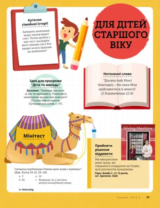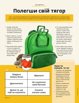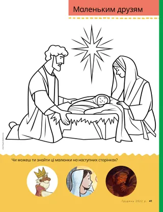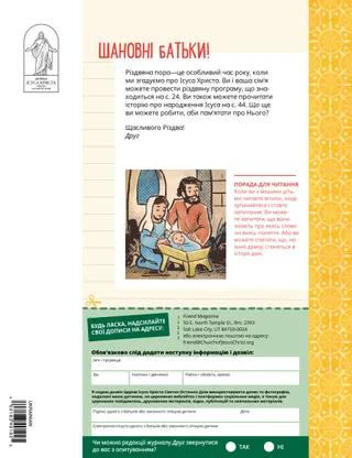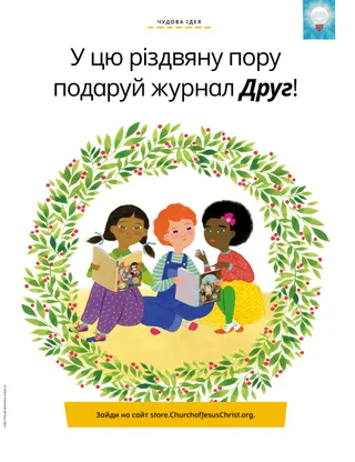 Грудень 2022 р. Дорогі друзі!Прочитайте послання про те, як ділитися світлом Христа у цю різдвяну пору. Друзі по листуваннюПрочитай кілька листів від наших друзів з усього світу! Рассел М. НельсонДілитися Світлом Ісуса ХристаПрочитай послання від Президента Рассела М. Нельсона про те, як ділитися Світлом Ісуса Христа. Джуліенн Тенні ДоманРіздвяна зіркаКейден хоче бути різдвяною зіркою у святковій виставі його сім’ї. За Мною йдіть За Мною йдіть: завданняВикористовуйте ці завдання під час навчання за посібником За Мною йдіть разом із сім’єю. Багато імен ІсусаПрочитай про багато імен Ісуса Христа, які вживаються у Писаннях. Картки “Герої з Писань”Збери картки, щоб дізнатися про видатних людей зі Старого Завіту! Цього місяця: Даниїл та Шадрах, Мешах і Авед-Неґо Полегши свій тягарВиконай це завдання, щоб дізнатися про покаяння. Чудова ідеяПоділися журналом Друг, зайшовши на сайт store.ChurchofJesusChrist.org. Марія Марта Моліна де МонтерросоПечиво, обійми і любовЕва та її сім’я у різдвяну пору служать іншим, готуючи печиво для дітей, які живуть у притулку. Пошук сімейних скарбівДізнайся більше про свою сім’ю і додай щось нове до коробки зі скарбами із сімейної історії. Час десятиниЗіграйте у гру про десятину “Знайди пару”. Познайомся з Юн Ію з ГонконгаПознайомся з Юн Ію з Гонконга і дізнайся, як він допомагає іншим так, як це робив Ісус. Ісус був терплячимПрочитай історію про те, як Ісус був терплячим, а потім склади план, щоб допомагати так, як це робив Він. Привіт з Гонконга!Дізнайся про Гонконг з Марго і Паоло! Мікаела ВілкінсДесятинний пирігМая дізнається, чому так важливо платити десятину. Шарлотта ЛарсабалСимволи РіздваВикористай матеріал цих сторінок, щоб провести особливий різдвяний захід зі своєю сім’єю. Уліссес СоаресЧому ми називаємо Ісуса Христа Спасителем?Прочитай послання старійшини Уліссеса Соареса про Ісуса Христа. Знайди це на малюнку!Чи можеш ти знайти на малюнку сховані предмети? Наслідувати Ісуса разомПідбірка дитячих цитат з усього світу. Мішель Д. КрейгДари, щоб ними ділитисяПрочитай послання сестри Мішель Д. Крейг про духовні дари. Знайди власника талантуЗнайди для кожної дитини її талант Метт і МендіМетт і Менді отримали різдвяну листівку від їхніх друзів Марго і Паоло. Для дітей старшого віку Для дітей старшого вікуПоради і завдання для дітей старшого віку. Люсі Стівенсон ЮеллЧіеко дізнається про ІсусаЧіеко мало що знає про Ісуса, але вона дізнається про Нього від місіонерів на Гаваях. Кімберлі УорнерЛіловий плюшевий ведмедикСпершу Лаєму не сподобався його різдвяний подарунок. Потім він дізнається, що цей подарунок свідчить про велику мамину любов до нього. Різдвяна майстерняСпробуй ці Різдвяні рецепти та вироби! Данідо І.Різдвяне служінняДанідо І. з Камбоджі розповідає, як він служив іншим під час Різдва. Маленьким друзям Маленьким друзямРозмалюй це зображення Різдва. Привіт, друзі!Познайомся з маленькими друзями з усього світу. Іди за зіркоюПройди лабіринтом, щоб допомогти мудрецям знайти немовля Ісуса. Дженніфер МеддіІсус народився!На Різдво прочитай історію народження Ісуса Христа. Джейн Мак-БрайдНова вчителькаАнна нервується щодо її нового класу у Початковому товаристві, але вона рада, коли допомагає своєму вчителю. Я люблю Ісуса ХристаНавчайте ваших маленьких дітей за допомогою євангельської стор