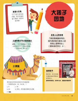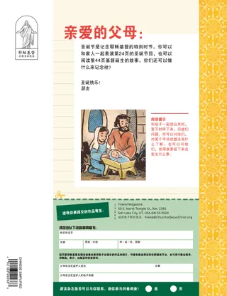 2022年12月 亲爱的朋友阅读一则在今年圣诞节分享基督之光的信息。 朋友天地阅读来自世界各地朋友的邮件! 罗素·纳尔逊分享耶稣基督的光阅读罗素·纳尔逊会长有关分享耶稣基督之光的信息。 茱莉安·杜曼圣诞星凯登想在自己家的基督诞生剧里扮演那颗圣诞星。 来跟从我 来跟从我活动运用这些活动,和家人一起研读来跟从我。 耶稣的许多名字阅读经文中所使用的耶稣基督的许多名字。 经文英雄卡收集卡片,来认识旧约中的一些重要人物!本月:但以理、沙得拉、米煞和亚伯尼歌 减轻你的重担进行这个活动,来学习悔改。 福音灵光藉由造访store.ChurchofJesusChrist.org来分享朋友杂志。 玛莉亚·孟特罗素饼干、拥抱和爱伊娃和家人在圣诞节做饼干,送给住在避难收容所里的孩子,藉此来为人服务。 家庭寻宝游戏认识你的家庭,并在你的家谱藏宝箱中,加入新的收藏。 什一奉献时间玩什一奉献配对游戏。 认识来自香港的俊义认识来自香港的俊义,了解他如何像耶稣一样帮助别人。 耶稣很有耐心阅读耶稣如何有耐心的故事,然后拟定一个计划,像祂那样去帮助人。 来自香港的问候!跟玛歌和保罗一起认识香港! 米凯拉·威金斯什一奉献派玛雅学到,为什么缴付什一奉献很重要。 夏绿蒂·拉卡贝圣诞节的标志用这几页和家人一起做一个特别的圣诞节活动。 尤理西斯·苏瑞我们为什么称呼耶稣基督为救主?阅读尤理西斯·苏瑞长老有关耶稣基督的信息。 找找看!你能在图片中找出隐藏的物件吗? 一同跟从耶稣来自世界各地儿童的话语。 米雪儿·奎格分享恩赐阅读米雪儿·奎格姊妹有关属灵恩赐的信息。 才能配对将每个儿童与他们所拥有的才能配对。 马太和曼蒂马太和曼蒂从朋友玛歌和保罗那里收到一张圣诞卡。 大孩子园地 大孩子园地给大孩子的建议和活动。 露西·艾维尔慧子学习有关耶稣的事慧子对耶稣了解不多,但她从夏威夷的传教士那里认识了祂。 金柏莉·瓦纳紫色泰迪熊连恩刚开始并不喜欢他的圣诞礼物,后来他学习到,这份礼物证明妈妈有多么爱他。 圣诞工作坊试做这些圣诞食谱和手工艺品! 丹尼多圣诞节的服务来自柬埔寨的丹尼多,分享他如何在圣诞节为人服务。 幼儿园地 幼儿园地为这张基督诞生的图片着色。 朋友,你好!认识世界各地的小朋友们。 跟随那颗星沿着正确的路线穿过迷宫,帮助博士找到婴孩耶稣。 珍妮弗·麦迪耶稣诞生了!阅读耶稣基督诞生的故事来迎接圣诞节。 珍·麦克布莱新教师安娜对于要上新的初级会班级感到紧张,但她帮助教师时,感到很快乐。 我爱耶稣基督用以福音为主的着色页来教导小小孩。这个月的信息是:「我爱耶稣基督。」 耶稣说海报信息:「耶稣说,祂为我来到世上。」 亲爱的父母阅读给父母的信息,了解如何在圣诞节记念耶稣基督。