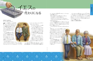 教会に着くと,デビッドはほかの執事たちと一緒にいちばん前の列にすわりました。ジェイコブはとなりにすわりました。デビッドは,せいさんを配るときに自分がイエスの代わりになることについて考えました。失敗してしまったらどうすればよいのでしょうか。デビッドがジェイコブの方を向くとジェイコブはにっこりとほほえみました。デビッドもほほえみ返し,深呼吸をしました。