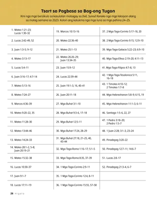 Kini nga mga bersikulo sa kasulatan mobagay sa Dali, Sunod Kanako nga mga leksiyon alang sa matag semana sa 2023. Kolori ang katukma nga mga luna sa mga pahina 24–25.