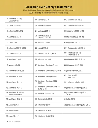 Disse skriftsteder følger Kom og følg mig-lektionerne til hver uge i 2023. Farvelæg de tilsvarende felter på side 24-25.