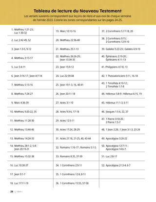 Les versets suivants correspondent aux leçons de Viens et suis-moi de chaque semaine de l’année 2023. Colorie les zones correspondantes sur les pages 24-25.