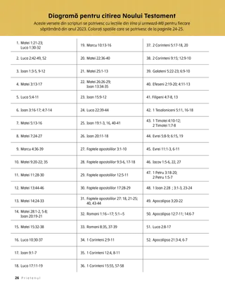 Aceste versete din scripturi se potrivesc cu lecțiile din Vino și urmează-Mă pentru fiecare săptămână din anul 2023. Colorați spațiile care se potrivesc de la paginile 24-25.