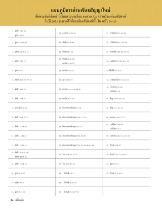 ข้อพระคัมภีร์เหล่านี้เรียงตามบทเรียน จงตามเรามา สำหรับแต่ละสัปดาห์ในปี 2023 ระบายสีให้ตรงช่องสัปดาห์นั้นใน หน้า 24–25