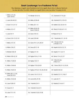 ʻOku fakatatau e ngaahi veesi folofola ko ʻení ki he ngaahi lēsoni Haʻu, ʻo Muimui ʻIate Au ki he uike taki taha ʻi he 2023. Valivali ʻa e ngaahi feituʻu ʻoku hoa tatau ʻi he peesi 24–25.