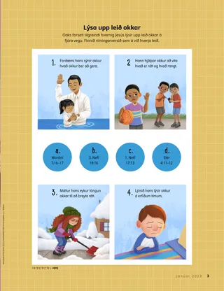 Oaks forseti tilgreindi hvernig Jesús lýsir upp leið okkar á fjóra vegu. Finnið ritningarversið sem á við hverja leið.