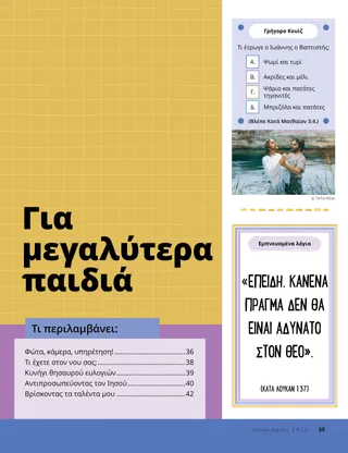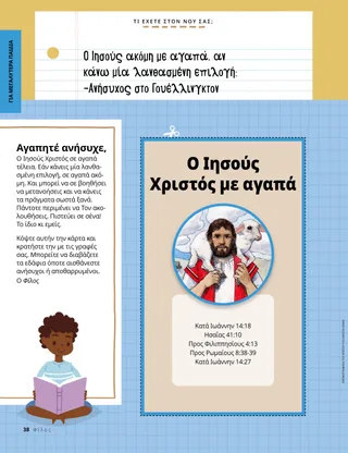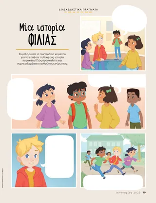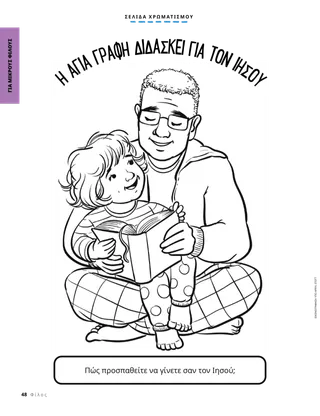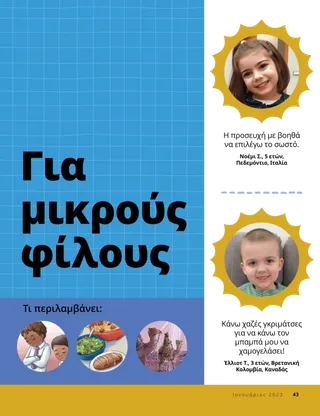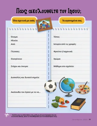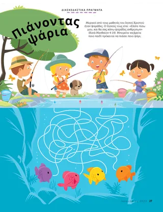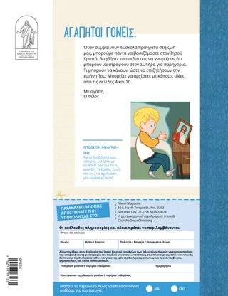 Ιανουάριος 2023 Αγαπητοί φίλοιΔιαβάστε ένα μήνυμα για το πώς να ακολουθείτε τον Ιησού μαζί. Φίλοι μέσω ταχυδρομείουΔιαβάστε κάποια αλληλογραφία από τους φίλους μας σε όλον τον κόσμο! Ντάλλιν ΌουκςΟ Ιησούς είναι το φως μαςΔιαβάστε ένα μήνυμα από τον Πρόεδρο Ντάλλιν Όουκς για τον Ιησού Χριστό. Ρίτσαρντ ΡόμνυΤόσος πολύς θόρυβος!Το σπίτι του Λουκ είναι θορυβώδες, αλλά βρίσκει ειρήνη εν Ιησού Χριστώ. Έλα, ακολούθα με Δραστηριότητες Έλα, ακολούθα μεΧρησιμοποιήστε αυτές τις δραστηριότητες για να μελετήσετε το Έλα, ακολούθα με, με την οικογένειά σας. Ταξίδι στην ΑίγυπτοΑκολουθήστε τον λαβύρινθο για να βοηθήσετε τη Μαρία, τον Ιωσήφ και τον Ιησού να βρουν τον δρόμο τους προς την Αίγυπτο. Ένα σχέδιο για εμέναΚάντε τη δραστηριότητα για να μάθετε για το μονοπάτι της διαθήκης σας. Πώς η Σίντα έγινε γενναίαΌταν η Σίντα έχει προβλήματα στο σχολείο, λαμβάνει μία ευλογία ιεροσύνης και την βοηθά να αισθάνεται γαλήνη και να είναι γενναία. Βρείτε το!Μπορείτε να βρείτε τα αντικείμενα κρυμμένα στην εικόνα; Πώς ακολουθείτε τον Ιησού;Συμπληρώστε αυτό το έντυπο και στείλτε το στον Φίλο για να μας πείτε πώς ακολουθείτε τον Ιησού! Ακολουθώντας τον Ιησού στην ΑγγλίαΓνωρίστε τη Λουσία, τη Βιβή και τον Ζακ από την Αγγλία και μάθετε πώς ακολουθούν τον Ιησού. Γεια από την Αγγλία!Κάντε ένα ταξίδι για να μάθετε για την Αγγλία! Σούζαν ΠόρτερΒοηθώντας στο έργο του Επουράνιου ΠατέραΔιαβάστε ένα μήνυμα από την αδελφή Σούζαν Πόρτερ σχετικά με τη βοήθεια στο έργο του Επουράνιου Πατέρα. Μία ιστορία φιλίαςΣυμπληρώστε τα κενά για να γράψετε τη δική σας ιστορία για τη φιλία. «Πες μία προσευχή, Ηλαμάν»Ο Ηλαμάν δίνει το παράδειγμα στους φίλους του, προσευχόμενος για το γεύμα του στο σχολείο. Φαεινή ιδέαΜία αφίσα με το μήνυμα: «Ο Ιησούς είναι το φως το αληθινό». Μάθιου Νήλυ και Νόλα ΝήλυΟ Χριστός είν’ το φωςΜάθετε να παίζετε μία απλοποιημένη έκδοση του «Ο Χριστός είν’ το φως». Μπορώ να διαβάσω την Καινή ΔιαθήκηΔιαβάστε εδάφια της Καινής Διαθήκης για κάθε εβδομάδα και μετά χρωματίστε τα κενά που ταιριάζουν. Πιάνοντας ψάριαΜπορείτε να βρείτε τα αντικείμενα κρυμμένα στην εικόνα; Ακολουθώντας τον Ιησού μαζίΜία συλλογή από παραθέματα παιδιών από όλον τον κόσμο. Τζέιν ΜακΜπράιντΑναμνήσεις με τη γιαγιάΗ γιαγιά ξεχνά πολλά πράγματα, αλλά η Μαρί μαθαίνει να είναι υπομονετική μαζί της και να εκτιμά τις ιστορίες της. Η Μάργκο και ο ΠάολοΓνωρίστε τη Μάργκο και τον Πάολο και την οικογένειά τους στη Βραζιλία! Ράσσελ ΜπάλλαρντΠώς μπορεί η οικογένειά σας να βοηθήσει ο ένας τον άλλον;Διαβάστε ένα μήνυμα από τον Πρόεδρο Ράσσελ Μπάλλαρντ σχετικά με την παροχή βοηθείας προς την οικογένειά σας. Για μεγαλύτερα παιδιά Για μεγαλύτερα παιδιάΠίνακας περιεχομένων για το τμήμα Για μεγαλύτερα παιδιά Σάντρα ΈντουαρντςΦώτα, κάμερα, υπηρέτηση!Κατά τη διάρκεια της πανδημίας του COVID-19, η Αντονέλλα και η Μαριάνα κάνουν βίντεο από το Έλα, ακολούθα με στα Ισπανικά. Τι έχετε στον νου σας;Κόψτε αυτήν την κάρτα και διαβάστε τις γραφές όποτε χρειάζεστε περισσότερη δύναμη. Κυνήγι Θησαυρού ΕυλογιώνΚάντε αυτό το κυνήγι θησαυρού ευλογιών για να σας βοηθήσει να είστε ευγνώμονες για όσα σας έχει δώσει ο Επουράνιος Πατέρας. Μικαέλα ΓουίλκινςΑντιπροσωπεύοντας τον ΙησούΟ Ντέιβιντ προετοιμάζεται, ώστε να μπορεί να αντιπροσωπεύει τον Ιησού, όταν διανέμει τη μετάληψη. Φρουεάν Π.Βρίσκοντας τα ταλέντα μουΔιαβάστε για το π