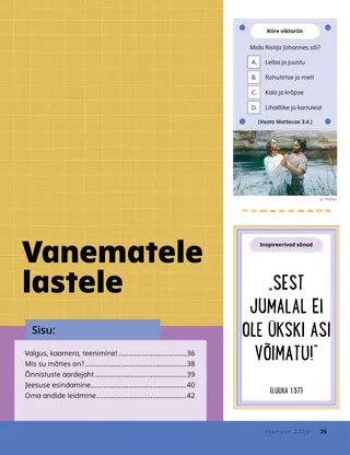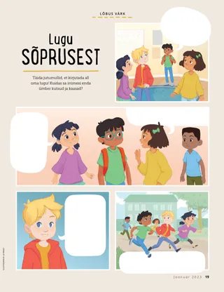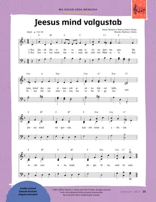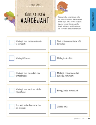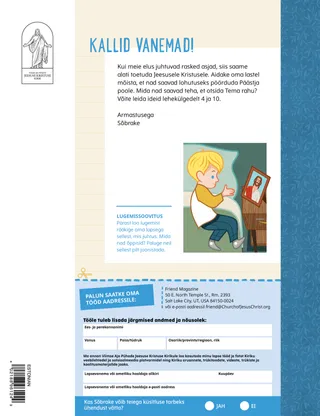 Jaanuar 2023 Kallid sõbrad!Lugege sõnumit koos Jeesuse järgimisest. Sõbrad posti teelLoe kirju meie sõpradelt üle maailma! Dallin H. OaksJeesus on meie valgusLoe president Dallin H. Oaksi sõnumit Jeesusest Kristusest. Richard M. RomneyNii palju lärmi!Luke’i kodus on lärm, kuid ta leiab rahu Jeesuses Kristuses. Tule, järgne mulle „Tule, järgne mulle” tegevusedKasutage neid tegevusi, et uurida koos perega „Tule, järgne mulle” õppetunde. Teekond EgiptusesseLäbi labürint, et aidata Maarjal, Joosepil ja Jeesusel leida tee Egiptusesse. Plaan minu jaoksTee tegevus, et õppida oma lepinguraja kohta. Kuidas Siedah muutus julgeksKui Siedah’l on koolis probleeme, siis saab ta preesterluse õnnistuse ja see aitab tal tunda rahu ning olla julge. Otsi üles!Kas sa leiad üles pildile peidetud asjad? Kuidas sa Jeesust järgid?Täida see blankett ja saada Sõbrakesele, et öelda meile, kuidas sina Jeesust järgid. Inglismaal Jeesust järgidesSaa tuttavaks Lucia, Vivie ja Zaciga Inglismaalt ning saa teada, kuidas nemad Jeesust järgivad. Tervitused Inglismaalt!Mine reisile, et saada Inglismaa kohta rohkem teada! Susan H. PorterTaevase Isa tööga aitamineLoe õde Susan H. Porteri sõnumit sellest, kuidas saad aidata nagu Jeesus. Lugu sõprusestTäida lüngad, et kirjutada omaenda lugu sõprusest. „Tee palve, Helamán”Helamán on sõpradele eeskuju, palvetades koolis enne lõunasööki. Hea mõtePlakat sõnumiga „Jeesus on tõeline valgus”. Matthew J. Neeley ja Nola P. NeeleyJesus Is My True LightÕpi mängima „” lihtsustatud versiooni Ma saan lugeda Uut TestamentiLoe iga nädal vastavaid Uue Testamendi salme ja värvi need ära. KalapüüdmineKas sa leiad üles pildile peidetud asjad? Koos Jeesust järgidesKollektsioon lastetsitaate kogu maailmast. Jane McBrideVanaemaga mäletamineVanaema unustab palju asju, kuid Mari õpib, kuidas temaga kannatlik olla ja tema lugusid hinnata. Margo ja PaoloSaa tuttavaks Margo ja Paolo ja nende perega Brasiilias! M. Russell BallardKuidas sinu pere saab üksteist aidata?Loe juhataja M. Russell Ballardi sõnumit oma perekonna aitamisest. Vanematele lastele Vanematele lasteleJaotise vanematele lastele sisukord Sandra EdwardsValgus, kaamera, teenimine!COVID-19 pandeemia ajal teevad Antonella ja Mariana „Tule, järgne mulle” hispaaniakeelseid videoid. Mis su mõttes on?Lõika välja see kaart ja loe pühakirju, mil iganes tunned, et vajad lisajõudu. Õnnistuste aardejahtTee seda õnnistuste aardejahti, mis aitab sul olla tänulik nende asjade eest, mille Taevane Isa on sulle andnud. Mikaela WilkinsJeesuse esindamineDavid valmistab end ette, et ta saaks sakramenti jagades esindada Jeesust. Fruean P.Oma annete leidmineLoe, kuidas Fruean P. arendas oma andeid laste- ja noorteprogrammi kaudu. Väiksematele sõpradele Väiksematele sõpradeleKohtu maailma erinevatest nurkadest pärit väikeste sõpradega. Ma saan järgida Jeesust palvetadesSaa teada, kuidas sa saad järgida Jeesust palvetades. Kingid JeesuseleLoe lugu, kuidas targad Hommikumaalt viisid Jeesusele Kristusele kinke. Piibel õpetab JeesusestÕpetage oma väikeseid evangeeliumikeskse värvimislehega. Selle kuu sõnum on „Piibel õpetab Jeesusest”. „Tule, järgne mulle” tegevused väikesteleKasutage neid tegevusi, et uurida väikeste lastega „Tule, järgne mulle” õppetunde. Kallid vanemadLugege vanematele mõeldud sõnumit Kristuses rahu leidmisest.