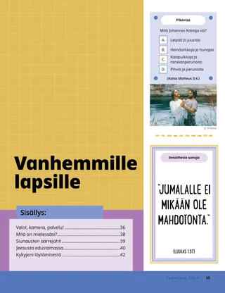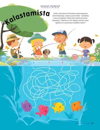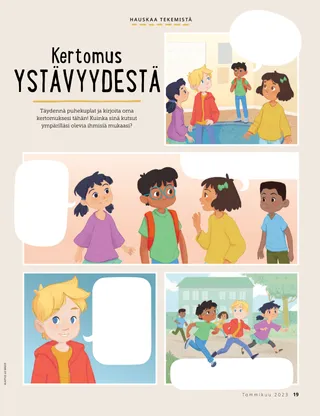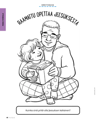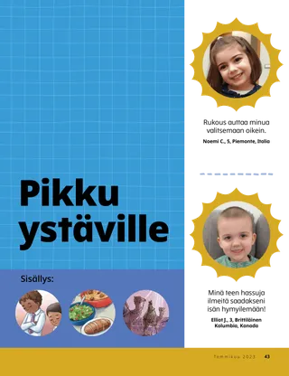 Tammikuu 2023 Rakkaat ystävätLukekaa yhdessä sanoma Jeesuksen seuraamisesta. Ystävät muuallaLue postia ystäviltämme eri puolilta maailmaa! Dallin H. OaksJeesus on meidän valommeLue presidentti Dallin H. Oaksin sanoma Jeesuksesta Kristuksesta. Richard M. RomneyTosi paljon meteliä!Luken talo on meluisa, mutta hän löytää rauhan Jeesuksessa Kristuksessa. Tule ja seuraa minua Tule ja seuraa minua – tekemistäKäytä näitä tehtäviä, kun tutkitte perheenne kanssa Tule ja seuraa minua -aineistoa. Matka EgyptiinSeuraa labyrinttia auttaaksesi Mariaa, Joosefia ja Jeesusta löytämään tien Egyptiin. Suunnitelma minua vartenTee toiminta oppiaksesi liittopolustasi. Kuinka Siedehista tuli rohkeaKun Siedehilla on vaikeuksia koulussa, hän saa pappeuden siunauksen, ja se auttaa häntä tuntemaan rauhaa ja olemaan rohkea. Etsi!Löydätkö tähän kuvaan piilotetut esineet? Kuinka sinä seuraat Jeesusta?Täytä tämä lomake ja lähetä se Ystävä-lehteen kertoaksesi meille, kuinka sinä seuraat Jeesusta! Jeesuksen seuraamista EnglannissaTutustu Luciaan, Vivieen ja Zaciin Englannista ja ota selville, kuinka he seuraavat Jeesusta. Tervehdys Englannista!Lähde matkaan ja tutustu Englantiin! Susan H. PorterAutamme taivaallisen Isän työssäLue sisar Susan H. Porterin sanoma siitä, kuinka auttaa taivaallisen Isän työssä. Kertomus ystävyydestäTäydennä tyhjät kohdat ja kirjoita oma kertomus ystävyydestä. ”Pidä rukous, Helamán”Helamán näyttää esimerkkiä ystävilleen rukoilemalla koulussa ruokatunnin alussa. Loistava ajatusJuliste, jossa on viesti: ”Jeesus on todellinen valo.” Matthew J. Neeley ja Nola P. NeeleyJesus Is My True LightOpettele soittamaan yksinkertaistettu versio laulusta ”Jesus Is My True Light”. Osaan lukea Uutta testamenttiaLue kullekin viikolle osoitetut Uuden testamentin jakeet ja väritä niitä vastaavat kohdat. KalastamistaLöydätkö tähän kuvaan piilotetut esineet? Yhdessä Jeesuksen jalanjäljissäKokoelma lasten ajatuksia ympäri maailman. Jane McBrideMuistelua mummin kanssaMummi unohtaa paljon asioita, mutta Mari oppii olemaan kärsivällinen häntä kohtaan ja arvostamaan hänen kertomuksiaan. Margo ja PaoloTutustu Margoon ja Paoloon ja heidän perheeseensä Brasiliassa! M. Russell BallardKuinka perheesi jäsenet voivat auttaa toisiaan?Lue presidentti M. Russell Ballardin sanoma perheesi auttamisesta. Vanhemmille lapsille Vanhemmille lapsilleVanhemmille lapsille -osuuden sisällysluettelo Sandra EdwardsValot, kamera, palvelu!Koronaviruspandemian aikana Antonella ja Mariana tekivät Tule ja seuraa minua -videoita espanjaksi. Mitä on mielessäsi?Leikkaa tämä kortti irti ja lue pyhien kirjoitusten kohtia aina kun tarvitset lisää voimaa. Siunausten aarrejahtiOsallistu tähän siunausten aarrejahtiin, joka auttaa sinua olemaan kiitollinen siitä, mitä taivaallinen Isä on antanut sinulle. Mikaela WilkinsJeesusta edustamassaDavid valmistautuu, jotta hän voi edustaa Jeesusta jakaessaan sakramentin. Fruean P.Kykyjeni löytämisestäLue, kuinka Fruean P. kehitti kykyjään Lasten ja nuorten ohjelman avulla. Pikku ystäville Pikku ystävilleTutustu muutamiin pikku ystäviimme eri puolilta maailmaa. Minä voin seurata Jeesusta rukoilemallaOpi, kuinka voit seurata Jeesusta rukoilemalla. Lahjoja JeesukselleLue kertomus siitä, kuinka tietäjät veivät lahjoja Jeesukselle Kristukselle. Raamattu opettaa JeesuksestaOpeta pieniä lapsiasi evankeliumiin liittyvän värityskuvan avulla. Tämän kuukauden sanoma on: ”Raamattu opettaa Jeesuksesta.” Tule ja seuraa minua -tehtäviä pikkuystävilleKäytä näitä tehtäviä tutkiessasi Tule ja seuraa minua -aineistoa pienten lastesi kanssa. Rakkaat vanhemmatLue vanhemmille tarkoitettu sanoma rauhan löytämisestä Kristuksessa.