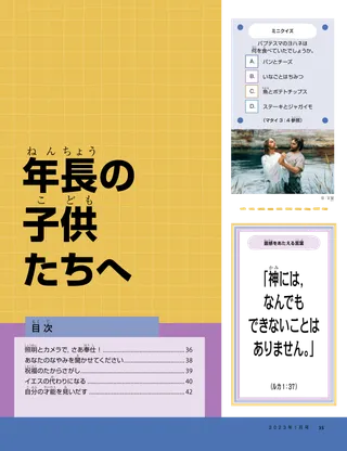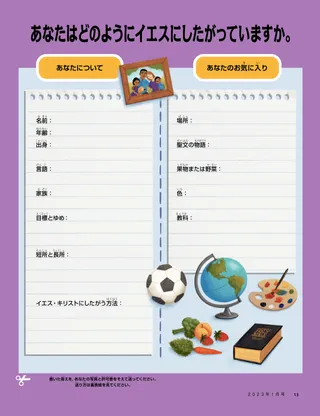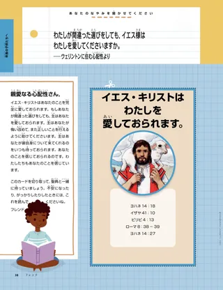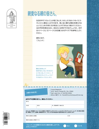 2023年1月 愛するフレンド(お友達)のみなさん一緒にイエスにしたがうことに関するメッセージを読んでください。 お友達からのお便り世界各地のお友達からのお便りをしょうかいします! ダリン・H・オークス「イエスはわたしたちの光」ダリン・H・オークス管長からの,イエス・キリストについてのメッセージを読みましょう。 リチャード・M・ロムニーさわがしい!ルークの家はさわがしいですが,ルークはイエス・キリストによって平安を見いだします。 『わたしにしたがってきなさい』 『わたしにしたがってきなさい』の活動これらの活動を使って『わたしにしたがってきなさい』を家族で研究しましょう。 エジプトへの旅迷路をたどって,マリヤ,ヨセフ,イエスがエジプトに向かう道を見つけられるように助けましょう。 わたしのための計画聖約の道について学ぶための活動を行ってください。 シーダが勇気を出せるようになるまでシーダは,学校でなやみがあると神権の祝福を受けます。すると,平安を感じて勇気を持っていられます。 見つけよう!絵の中にかくれているものを見つけられますか? あなたはどのようにイエスにしたがっていますか。この用紙に記入して『フレンド』に送り,あなたがどのようにイエスにしたがってといるのか,教えてください。 イングランドでイエスにしたがうイングランドのルシアとビビー,ザックを紹介します。3人がどのようにイエスにしたがっているか学びましょう。 イングランドからこんにちは!旅をしてイングランドについて知りましょう! スーザン・H・ポーター天のお父様のお仕事を手伝う天のお父様のお仕事を手伝うことに関するスーザン・H・ポーター姉妹のメッセージを読んでください。 友情の物語空欄に言葉を入れて,あなただけの友情の物語を作りましょう。 「ヒラマン,おいのりして。」ヒラマンは学校で昼食のためにいのることで,友達にもはんをしめします。 すばらしいアイデア「イエスはまことの光です」というメッセージが書かれたポスター マシュー・J・ニーリー,ノラ・P・ニーリーイエス様はまことの光「イエス様はまことの光」の簡略版を演奏できるようになりましょう。 わたしは新約聖書を読むことができますその週の新約聖書のせいくを読んでから,この絵の同じ番号が書かれた場所に色をぬりましょう。 魚をとる絵の中にかくれているものを見つけられますか? ともにイエスにしたがう世界中から集まった子供たちの言葉。 ジェーン・マクブライドおばあちゃんと一緒に思い出すおばあちゃんはいろんなことをわすれますが,マリはにんたい強く,おばあちゃんの話に感謝しようと努めています。 マルゴとパオロブラジルのマルゴとパオロとその家族をしょうかいします! M・ラッセル・バラード家族でどのように助け合えるでしょう?家族を助けることについてのM・ラッセル・バラード会長のメッセージを読みましょう。 年長の子供たちへ 年長の子供たちへ年長の子供向けセクションの目次 サンドラ・エドワーズ照明とカメラで,さあ奉仕!新型コロナウイルス感染症のパンデミックが起きている間,アントネラとマリアナは「わたしにしたがってきなさい」のビデオをスペイン語で作りました。 あなたのなやみを聞かせてくださいこのカードを切り取り,特別な力が必要なときはいつでもそのせいくを読んでください。 祝福のたからさがし祝福のたからさがしをして,天のお父様があたえてくださったものに感謝しましょう。 ミカエラ・ウィルキンスイエスの代わりになるデビッドは,せいさんのパスをするときにイエスの代わりになれるように自分をそなえます。 フリアン・P自分の才能を見いだす「子供と青少年」プログラムを通して,フリアン・Pがどのように才能をのばしたか,読んでみましょう。 小さなお友達へ 小さなお友達へ世界各地の小さなフレンドたちをしょうかいします。 イエス・キリストのもはんにしたがっていのりますどうしたらイエスにしたがっていのることができるか,学びましょう。 イエスへのおくり物博士たちがイエス・キリストにおくり物を持って来た話を読みましょう。 聖書はイエス様について教えています福音を中心としたぬりえを使って小さな子供たちを教えましょう。今月のメッセージは,「聖書はイエス様について教えています」です。 小さなお友達のための『わたしに従ってきなさい』の活動小さな子供たちと一緒に『わたしに従ってきなさい』を研究するために,このアイデアを活用してください。 親愛なる親の皆さんキリストによって平安を見いだすことについて,親へのメッセージをお読みください。