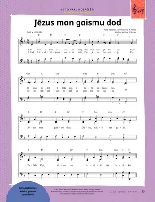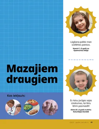 2023. gada janvāris Dārgie draugi!Izlasiet vēstījumu par to, kā kopīgi sekot Jēzum. Vēstuļu draugiIzlasi dažas mūsu draugu vēstulītes no visas pasaules! Dalins H. OukssJēzus ir mūsu GaismaIzlasi prezidenta Dalina H. Ouksa vēstījumu par Jēzu Kristu. Ričards M. RomnijsTik liels troksnis!Lūkasa mājas ir trokšņainas, taču viņš rod mieru Jēzū Kristū. Nāciet, sekojiet Man! „Nāciet, sekojiet Man!” uzdevumiIzmantojiet šos uzdevumus, kopā ar ģimeni studējot Nāciet, sekojiet Man!. Ceļojums uz ĒģiptiAtrodi īsto ceļu labirintā un palīdzi Marijai, Jāzepam un Jēzum nonākt Ēģiptē. Man paredzētais plānsIzpildi uzdevumu, lai uzzinātu par savu derību ceļu. Kā Saīda kļuva drosmīgaKad Saīdai ir grūtības skolā, viņa saņem priesterības svētību, un tā palīdz viņa sajust mieru un būt drosmīgai. Atrodi!Vai vari atrast attēlā apslēptos priekšmetus? Kā tu seko Jēzum?Aizpildi šo anketu un nosūti to žurnālam „Draugs”, lai pastāstītu mums, kā tu seko Jēzum! Sekojam Jēzum AnglijāIepazīsti Lusiju, Viviju un Zaku no Anglijas un uzzini, kā viņi seko Jēzum. Sveicieni no Anglijas!Dodies ceļojumā, lai uzzinātu par Angliju! Sjūzena H. PorterePalīdzēt Debesu Tēva darbāIzlasi māsas Sjūzenas H. Porteres vēstījumu par to, kā varam palīdzēt Debesu Tēva darbā. Stāsts par draudzībuAizpildi tukšās vietas, izveidojot savu stāstu par draudzību. „Noskaiti lūgšanu, Helaman!”Helamans rāda saviem draugiem piemēru, kad skolā pirms pusdienošanas viņš noskaita lūgšanu. Spoža idejaPlakāts ar vēstījumu: „Jēzus ir patiesā gaisma.” Metjū Dž. Nīlijs un Nola P. NīlijaJesus Is My True LightIemācies nospēlēt dziesmas „Jesus Is My True Light” vienkāršoto versiju. Es varu izlasīt Jauno DerībuIzlasi Jaunās Derības pantus, kas paredzēti katrai nedēļai, un pēc tam izkrāso atbilstošo laukumiņu. MakšķerēšanaVai vari atrast attēlā apslēptos priekšmetus? Sekojam Jēzum kopāBērnu izteikumu apkopojums no dažādām pasaules vietām. Džeina MakbraidaAtcerēties kopā ar vecmāmiņuVecmāmiņa daudz ko aizmirst, bet, esot kopā ar viņu, Mari mācās būt pacietīga un novērtēt viņas stāstus. Margo un PauloSatiec Margo un Paulo un viņu ģimeni Brazīlijā! M. Rasels BalardsKā tavas ģimenes locekļi var cits citam palīdzēt?Izlasi prezidenta M. Rasela Balarda vēstījumu par palīdzēšanu savai ģimenei. Vecākiem bērniem Vecākiem bērniemSatura rādītājs sadaļai „Vecākiem bērniem” Sandra EdvardsaGaismas, kamera, kalpošana!Covid-19 pandēmijas laikā Antonella un Marianna veido Nāciet, sekojiet Man! video filmiņas spāņu valodā. Par ko tu domā?Izgriez šo kartīti un izlasi šīs rakstvietas ikreiz, kad tev vajadzīgs papildu spēks. Svētību medībasPiedalies svētību medībās, lai sajustu pateicību par to, ko Debesu Tēvs tev ir dāvājis. Mikaela VilkinsaPārstāvēt JēzuDeivids sagatavojās, lai viņš varētu pārstāvēt Jēzu, kad viņš pasniegs Svēto Vakarēdienu. Fruens P.Atrast savus talantusIzlasi par to, kā Fruens P. attīstīja savus talantus, pateicoties Bērnu un jauniešu programmai. Mazajiem draugiem Mazajiem draugiemIepazīsti dažus mazos draugus no visas pasaules. Es varu sekot Jēzum, sakot lūgšanasUzzini, kā tu vari sekot Jēzum, sakot lūgšanas. Dāvanas JēzumIzlasi stāstu par to, kā gudrie vīri atnesa Jēzum Kristum dāvanas. Bībele māca par JēzuMāciet savus mazos bērniņus, izmantojot evaņģēlijā balstītu krāsojamo lappusīti. Šī mēneša vēstījums ir: „Bībele māca par Jēzu”. Nāciet, sekojiet Man! uzdevumi pašiem mazākajiemIzmantojiet šos uzdevumus, lai kopā ar bērniem studētu Nāciet, sekojiet Man!. Dārgie vecāki!Izlasiet vēstījumu vecākiem par miera rašanu Jēzū Kristū.