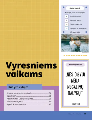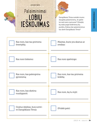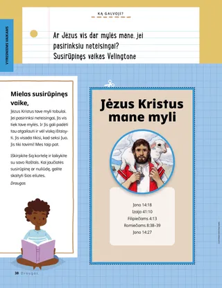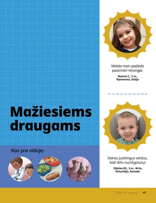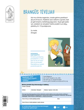 2023 m. sausis Brangūs draugai!Perskaitykite žinią apie sekimą Jėzumi drauge. Draugų paštasPerskaitykite kelis mūsų draugų iš viso pasaulio laiškus! Dalinas H. OuksasJėzus yra mūsų šviesaPerskaitykite prezidento Dalino H. Oukso žinią apie Jėzų Kristų. Ričardas M. RomnisToks triukšmas!Luko namai triukšmingi, bet jis randa ramybę Jėzuje Kristuje. „Ateik ir sek paskui mane“ Ateik ir sek paskui mane užduotėlėsŠias užduotėles atlikite su savo šeima studijuodami Ateik ir sek paskui mane. Pabėgimas į EgiptąPadėkite Marijai, Juozapui ir Jėzui per labirintą rasti kelią į Egiptą. Planas, skirtas manAtlik šią užduotėlę, kad sužinotum apie savo sandoros kelią. Kaip Syda tapo drąsiMokykloje susidūrusi su sunkumais, Syda gauna kunigystės palaiminimą ir vėl jaučiasi rami ir drąsi. Surask!Ar sugebėsi šiame paveikslėlyje rasti paslėptus daiktus? Kaip tu seki Jėzumi?Užpildyk šią formą ir nusiųsk ją „Draugui“, kad papasakotum, kaip tu seki Jėzumi! Sekimas Jėzumi AnglijojeSusipažinkite su Liučija, Vivija ir Zaku iš Anglijos ir sužinokite, kaip jie seka Jėzumi. Linkėjimai iš Anglijos!Leiskis į pažintinę kelionę po Angliją! Siuzana H. PorterPagalba Dangiškojo Tėvo darbePerskaitykite sesers Siuzanos H. Porter pranešimą apie pagalbą Dangiškojo Tėvo darbe. Pasakojimas apie draugystęUžpildykite tuščius laukelius, kad parašytumėte savo pasakojimą apie draugystę. „Sukalbėk maldą, Helamanai“Helamanas savo draugams parodė pavyzdį, pasimelsdamas prieš pietus mokykloje. Gera mintisPlakatas su žinia: „Jėzus – tikroji šviesa“ Matthew J. Neeley and Nola P. NeeleyJesus Is My True LightIšmok sugroti supaprastintą dainelės “Jesus Is My True Light” versiją. Galiu skaityti Naująjį TestamentąPerskaityk kiekvienos savaitės Naujojo Testamento ištraukas ir po to nuspalvink jas atitinkančius laukelius. ŽvejojimasAr sugebėsi šiame paveikslėlyje rasti paslėptus daiktus? Sekime Jėzumi draugeVaikų žodžiai iš viso pasaulio. Džeinė MakbraidPrisiminimas su močiuteMočiutė daug ką pamiršta, bet Mari mokosi būti su ja kantri ir vertinti jos istorijas. Margo ir PaoloSusipažinkite su Margo ir Paolo bei jų šeima Brazilijoje! M. Raselas BalardasKaip jūsų šeimos nariai gali padėti vieni kitiems?Perskaitykite prezidento M. Raselo Balardo žinią apie pagalbą savo šeimai. Vyresniems vaikams Vyresniems vaikamsVyresniems vaikams skirto skyriaus turinys Sandra EdvardsŠviesos, kamera, tarnaujam!COVID–19 pandemijos metu Antonela ir Mariana kuria Ateik ir sek paskui mane filmukus ispanų kalba. Ką galvoji?Iškirpkite šią kortelę ir skaitykite Raštus, kai tik prireiks papildomų jėgų. Palaiminimai Lobių ieškojimasŠis palaiminimų lobių ieškojimas padės jums būti dėkingesniems už tai, ką Dangiškasis Tėvas jums davė. Mikaela VilkinsAtstovavimas JėzuiDeividas ruošiasi, kad, teikdamas sakramentą, galėtų atstovauti Jėzui. Fruenas P.Atpažink savo talentusSkaityk apie tai, kaip Fruenas P. ugdė savo talentus per Vaikų ir jaunimo programą. Mažiesiems draugams Mažiesiems draugamsSusipažinkite su mažaisiais draugais iš viso pasaulio. Galiu sekti Jėzumi melsdamasisSužinok, kaip gali sekti Jėzumi melsdamasis. Dovanos JėzuiPerskaitykite pasakojimą apie tai, kaip išminčiai atnešė dovanų Jėzui Kristui. Biblija moko apie JėzųMokykite savo mažutėlius naudodamiesi spalvinimo puslapiu Evangelijos tema. Šio mėnesio žinia – „Biblija moko apie Jėzų“. „Ateik ir sek paskui mane“ užduotėlės mažutėliamsŠias užduotėles su savo mažutėliais atlikite studijuodami Ateik ir sek paskui mane. Brangūs tėveliai!Perskaitykite žinią apie tai, kaip rasti ramybę Jėzuje Kristuje.