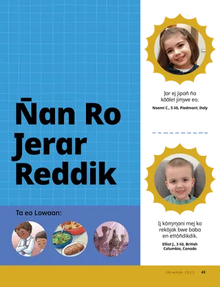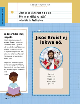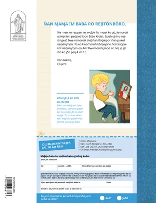 Jānwōde 2023 Ro M̧ōtta RejitōnbōroRiiti juon ennaan kōn ļoore Jisōs ippan̄ doon. Ro Jerar ilo MeeļRiiti jet meeļ jān ro jerar ipeļaakin laļ in! Dallin H. OaksJisōs Ej Ad MeramRiiti juon ennaan jān Būreejtōn Dallin H. Oaks kōn Jisōs Kraist. Richard M. RomneyLukkuun Ļap Kōwaron̄ron̄!M̧weo im̧ōn Luke ekōwaron̄ron̄, ak ej kappukot aenōm̧m̧an ilo Jisōs Kraist. Itok, Ļoor Eō Itok, Ļoor Eō M̧akūtkūt koKōjerbal m̧akūtkūt kein n̄an ekkatak Itok, Ļoor Eō ippān baam̧le eo am̧. Em̧m̧akūt n̄an IjiptĻoore iaļ eo n̄an jipan̄ Meri, Josep, im Jisōs pukōt iaļ eo aer ļo̧k n̄an Ijipt. Juon Karōk n̄an N̄aKōm̧m̧ane m̧akūtkūt in n̄an ekkatak kōn iaļ in bujen eo am̧. Ewi wāween an Siedah Kar PeranN̄e Siedah ej apan̄ ilo jikuul, ej bōke juon kōjeram̧m̧an an priesthood im ej jipan̄e en̄jake aeņōm̧m̧an im peran. Kappukot E!Komaron̄ ke kappukot aitōm ko kar ņooji ilo pija eo? Elmen Am̧ Ļoor Jisōs?Kanne peba in im jilkinļo̧k n̄an Jera n̄an kwaļo̧k n̄an kōj elmen am̧ ļoor Jisōs! Ļoor Jisōs ilo EnglandJeļā kajjien Lucia, Vivie, im Zac jān England im ekkatak jān ekōjkan aer ļoor Jisōs. Iakwe jān England!Bōk juon ien jambo n̄an ekkatak kōn England! Susan H. PorterJipan̄ ilo Jerbal in ad Jemedwōj Ilan̄Riiti juon ennaan jān Sister Susan H. Porter kōn wāween jipan̄ ilo jerbal eo an Jemedwōj Ilan̄. Juon Bwebwenato kōn Jem̧jerāKanne ijoko ejjeļo̧k kobbaer ilo am̧ jeje kōn bwebwenato eo am̧ make kōn jem̧jerā eo am̧. ”Jar, Helamán”Helamán ej kōm̧m̧an juon waanjon̄ak n̄an ro m̧ōttan ilo an jar kōn m̧ōn̄ā in rālep eo kijen ilo jikuuļ. Ļōmņak eo Em̧m̧anJuon peba killep kōn ennaan eo, “Jisōs ej meram eo em̧ool.” Matthew J. Neeley im Nola P. NeeleyJisōs Ej Meram eo Aō Em̧oolEkkatak n̄an kōjan̄jan̄ juon wāween eo epidodo in, “Jesus Is My True Light.” Imaron̄ Riiti Kallim̧ur EkāālRiiti eoon ko ilo Kallim̧ur Ekāāl n̄an kajjojo wiik innām kōļari ilo jekjek ko remāāje doon. Eo̧n̄ōd EkKomaron̄ ke kappukot aitōm ko kar ņooji ilo pija eo? Ļoor Jisōs Ippān DoonJuon kōro̧ro in kout ko im pija an ajri ro jān aolepān laļ in. Jane McBrideKeememej ippān BubuBubu ej meļo̧kļo̧k elōn̄ men ko, ak Mari ej katak ilo an kijenmej ippān im lem̧ōņōņō kōn bwebwenato ko an. Margo im PaoloJeļā kajeen Margo im Paolo im baam̧le eo aer ilo Brazil! M. Russell BallardElmen An Baam̧le Eo Am̧ Jipan̄ Doon?Riiti juon ennaan jān Būreejtōn M. Russell Ballard kōn jipan̄ baam̧le eo am̧. N̄an Ajri ro Rōrūttoļo̧k N̄an Ajri ro Rōrūttoļo̧kMen ko kobban n̄an jākjōn eo an Ajri ro Rōrūttoļo̧k Sandra EdwardsLait ko, Camera, Jerbal in Jipan̄!Ilo iien COVID-19 nan̄inmej eo, Antonella im Mariana rekar kōm̧m̧an Itok, Ļoor Eō pijaan alwōj ko ilo kajin Spanish. Ta eo ilo Ļōmņak eo Am̧?Mwijiti kaat in im riiti jeje ko rekwojarjar jabdewōt iien kwoj aikuj eļapļo̧k kajoor. Kappukot Menin Kōjeram̧m̧an koKappukot menin kōjeram̧m̧an ko n̄an jipan̄ kwe kam̧m̧oolol kōn ta eo Jemedwōj Ilan̄ ej lewaj n̄an kwe. Mikaela WilkinsJutak kōn JisōsDavid ej kōpooj e make bwe en maron̄ jutak kōn Jisōs n̄e ej ajeej e kwojkwoj eo. Fruean P.Pukōt Tōlan ko AōRiit kōn wāween an Fruean P. kōļapļo̧k tōļan eo an ilo būrookraam̧ eo an Ajri ro im Jodikdik ro. N̄an Ro Jerar Reddik N̄an Ro Jerar ReddikIioon jet jerar ro reddik jān ipeļaakin laļ in. Imaron̄ Ļoore Jisōs ilo JarKatak wāween am̧ maron̄ ļoore Jisōs ilo jar. Menin Leļo̧k n̄an JisōsRiiti juon bwebwenato kōn elmen an Rimālōtlōt ro bokļo̧k menin leļo̧k ko aer n̄an Jisōs Kraist. Baibōl eo ej Katakin kōn JisōsKatakin ro nejūm̧ reddik kōn peij in kōļar eo an pedped ioon gospel eo. Ennaan eo an allōn̄ in, “Baibōl eo ej katakin kōn Jisōs.” Itok, Ļoor Eō M̧akūtkūt ko n̄an Ajri Jiddik RoKōjerbal m̧akūtkūt kein n̄an ekkatak Itok, Ļoor Eō ippān ajri jiddik ro am̧. N̄an M̧am̧a im Baba ro RejitōnbōroRiiti juon ennaan n̄an m̧am̧a im baba kōn kapukkot aeņōm̧m̧an ilo Jisōs Kraist.
