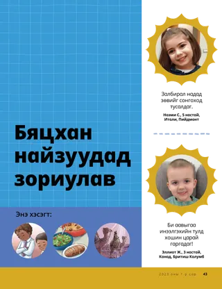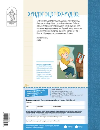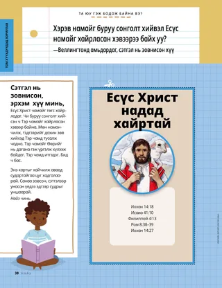 2023 оны 1-р сар Эрхэм найзууд ааХамтдаа Есүсийг дагах тухай захиасыг уншина уу. Захидлын найзуудДэлхий даяарх найзуудынхаа илгээсэн захидлыг уншаарай! Даллин Х.ӨүксЕсүс бол бидний ГэрэлЕрөнхийлөгч Даллин Х.Өүксийн Есүс Христийн талаарх захиасыг уншаарай. Ричард М.РомниДэндүү шуугиантай байлаа!Лукийн гэрт чимээ шуугиантай байсан ч Есүс Христээр дамжуулан тэр амар амгаланг мэдэрчээ. Ирээд, Намайг дага Ирээд, Намайг дага үйл ажиллагааИрээд, Намайг дага гарын авлагыг гэр бүлээрээ судлахдаа эдгээр үйл ажиллагааг ашиглаарай. Египет рүү хийсэн аялалМариа, Иосеф, Есүс гуравт Египет рүү хүрэх замаа олоход нь туслаарай. Надад зориулсан төлөвлөгөөГэрээний замынхаа талаар суралцах үйл ажиллагааг хий. Саяида хэрхэн зоригтой болсон тухайСаяида сургууль дээрээ асуудалтай тулгарсан ч санваарын адислал авснаар амар амгаланг мэдэрч, зоригтой болжээ. Үүнийг хайж ол!Та нар зурагт нуугдсан зүйлсийг олж чадах уу? Та нар Есүсийг хэрхэн дагаж байна вэ?Энэ хуудсыг бөглөөд Найз сэтгүүлд илгээж, Есүсийг хэрхэн дагадаг тухайгаа бидэнтэй хуваалцана уу! Англид Есүсийг дагаж байгаа ньАнглид амьдардаг Лүсиа, Виви, Зак гуравтай танилцан, тэд хэрхэн Есүсийг дагадгийг олж мэд. Англиас мэндчилж байна!Англи улстай танилцах аялалд тавтай морил! Сюзан Х.ПортэрТэнгэрлэг Эцэгийн ажилд туслахТэнгэрлэг Эцэгийн ажилд туслах талаарх Сюзан Х.Портэр эгчийн захиасыг уншаарай. Нөхөрлөлийн түүхХоосон зайд нөхөрлөлийн түүхээ бичээрэй. “3албирал хэлээч, Хиламан”Хиламан сургуулийнхаа өдрийн хоолны үеэр залбирал хэлснээр найзууддаа үлгэр жишээ үзүүлжээ. Ухаалаг санаа“Есүс бол жинхэнэ гэрэл” гэсэн захиас бүхий зурагт хуудас Маттю Ж.Нийли, Нола П.НийлиЕсүс бол миний жинхэнэ гэрэл“Есүс бол миний жинхэнэ гэрэл” дууны хялбаршуулсан хувилбарыг тоглож сураарай. Би Шинэ Гэрээг уншиж чаднаДолоо хоног бүр Шинэ Гэрээний шүлгээс уншаад, тохирох зайг будаарай. Загас барихТа нар зурагт нуугдсан зүйлсийг олж чадах уу? Есүсийг хамтдаа дагах ньДэлхий даяарх хүүхдүүдийн хэлсэн үгээс эш татсан түүвэр Жэйн МакбрайдЭмээтэйгээ хамт санан дурссан ньЭмээ нь олон зүйлийг мартдаг ч Мари түүнд тэвчээртэй хандаж, түүхэд нь талархаж сурчээ. Марго, Паоло хоёрБразилд амьдардаг Марго, Паоло хоёртой мөн тэдний гэр бүлтэй танилцаарай! М.Рассэлл БаллардТанай гэр бүл нэг нэгэндээ хэрхэн тусалж чадах вэ?Гэр бүлдээ туслах талаарх ерөнхийлөгч М.Рассэлл Баллардын захиасыг уншаарай. Том хүүхдүүдэд зориулав Том хүүхдүүдэд зориулавТом хүүхдүүдэд зориулсан хэсгийн гарчгийн жагсаалт Сандра ЭдвардсГэрэл, камер, үйлчлэл!КОВИД-19 цар тахлын үеэр Антонэлла, Мариана хоёр Ирээд, Намайг дага цуврал видео бичлэгийг испани хэлээр бүтээжээ. Ta юу гэж бодож байна вэ?Энэ картыг хайчилж аваад, нэмэлт хүч чадал хэрэгтэй үед эдгээр судрыг унш. Адислалын эрэлдТэнгэрлэг Эцэгийн та нарт өгсөн зүйлсэд талархалтай байхад туслах учраас адислалын эрэлд гараарай. Микаэла ВилкинсЕсүсийг төлөөлөх ньДэвид ариун ёслолыг түгээх үедээ Есүсийг төлөөлөхийн тулд өөрийгөө бэлджээ. Фрүэн П.Авьяасаа олох ньХүүхэд, өсвөр үеийнхний хөтөлбөрөөр дамжуулан Фрүэн П. авьяас чадвараа хэрхэн хөгжүүлсэн тухай уншина уу. Бяцхан найзуудад зориулав Бяцхан найзуудад зориулавДэлхийн өнцөг булан бүрээс ирсэн найзуудтайгаа танилцаарай. Би залбирснаар Есүсийг дагаж чаднаЗалбирснаар Есүсийг хэрхэн дагаж болохыг мэдэж аваарай. Есүст зориу