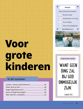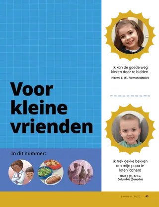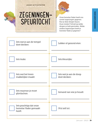 Januari 2023 Dag vriendjesLees een boodschap over samen Jezus volgen. Post van vriendjesLees post van vriendjes over de hele wereld! Dallin H. OaksJezus is ons lichtLees een boodschap van president Dallin H. Oaks over Jezus Christus. Richard M. RomneyZoveel lawaai!Er is veel lawaai bij Luke thuis, maar hij vindt rust in Jezus Christus. Kom dan en volg Mij Activiteiten Kom dan en volg MijDit zijn extra ideeën voor de wekelijkse leesopdracht in Kom dan en volg Mij – voor personen en gezinnen. Reis naar EgypteVolg het doolhof om Maria, Jozef en Jezus te helpen de weg naar Egypte te vinden. Een plan voor mijDoe de activiteit om meer over jouw verbondspad te weten te komen. Hoe Siedeh moedig werdSiedeh krijgt een zegen omdat ze het moeilijk heeft op school, waardoor ze vrede en moed krijgt. Zoeken maar!Kun je de verborgen voorwerpen vinden? Hoe volg jij Jezus?Vul dit formulier in en stuur het naar de Vriend om ons te vertellen hoe jij Jezus volgt! Jezus volgen in EngelandMaak kennis met Lucia, Vivie en Zac uit Engeland en kom te weten hoe ze Jezus volgen. Groetjes uit Engeland!Ga mee op reis om meer over Engeland te weten te komen! Susan H. PorterOnze hemelse Vader met zijn werk helpenLees een boodschap van zuster Susan H. Porter over onze hemelse Vader met zijn werk helpen. Een verhaal over vriendschapVul de lege tekstballonnen in en schrijf je eigen verhaal over vriendschap. ‘Zeg maar een gebed, Helamán’Helamán is een voorbeeld voor zijn vrienden door voor zijn lunch op school te bidden. Schitterend ideeEen poster met de boodschap: ‘Jezus is het ware licht.’ Matthew J. Neeley en Nola P. NeeleyJezus is mijn ware lichtLeer een vereenvoudigde versie van ‘Jezus is mijn ware licht’ spelen. Ik kan in het Nieuwe Testament lezenLees elke week een aantal verzen in het Nieuwe Testament en kleur de bijbehorende vakjes in. Vissen vangenKun je de verborgen voorwerpen vinden? Samen Jezus volgenEen verzameling uitspraken van kinderen uit de hele wereld. Jane McBrideHerinneringen ophalen met omaOma vergeet veel, maar Mari leert geduld met haar te hebben en haar verhalen te waarderen. Margo en PaoloDit zijn Margo en Paolo en hun familie in Brazilië! M. Russell BallardHoe kunnen je familieleden elkaar helpen?Lees hoe je volgens president M. Russell Ballard je familieleden kunt helpen. Voor grote kinderen Voor grote kinderenInhoudsopgave katern Voor grote kinderen Sandra EdwardsLichten, camera, dienstbetoon!Tijdens de COVID-19-pandemie maken Antonella en Mariana Spaanstalige video’s over Kom dan en volg Mij. Waar denk je aan?Knip dit kaartje uit en lees de Schriftteksten wanneer je extra kracht nodig hebt. ZegeningenspeurtochtDeze zegeningenspeurtocht helpt je om dankbaar te zijn voor alles wat je hemelse Vader je heeft gegeven. Mikaela WilkinsJezus vertegenwoordigenDavid bereidt zich voor zodat hij Jezus kan vertegenwoordigen als hij het avondmaal ronddient. Fruean P.Mijn talenten ontdekkenLees hoe Fruean P. zijn talenten door het programma Kinderen en jongeren heeft ontwikkeld. Voor kleine vrienden Voor kleine vriendenMaak kennis met vriendjes over de hele wereld. Ik kan Jezus volgen door te biddenLeer hoe je Jezus kunt volgen door te bidden. Geschenken voor JezusLees een verhaal over de wijzen die geschenken naar Jezus Christus brachten. In de Bijbel komen we meer over Jezus te wetenOnderwijs uw kleintjes met een evangeliegerichte kleurplaat. De boodschap van deze maand is: ‘In de Bijbel komen we meer over Jezus te weten.’ Activiteiten Kom dan en volg Mij voor kleine kinderenActiviteiten om Kom dan en volg Mij met kleine kinderen te bestuderen. Beste oudersLees een boodschap voor ouders over vrede vinden in Jezus Christus.