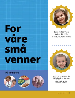 Januar 2023 Kjære vennerLes et budskap om å følge Jesus sammen. Venner via postLes litt post fra våre venner rundt om i verden! Dallin H. OaksJesus er vårt lysLes et budskap fra president Dallin H. Oaks om Jesus Kristus. Richard M. RomneySå mye støy!Lukas’ hus er bråkete, men han finner fred i Jesus Kristus. Kom, følg med meg Kom, følg med meg-aktiviteterBruk disse aktivitetene til å studere Kom, følg med meg sammen med familien. Reisen til EgyptFølg labyrinten for å hjelpe Maria, Josef og Jesus å finne veien til Egypt. En plan for megGjør aktiviteten for å lære om din pakts sti. Hvordan Siedeh ble modigNår Siedeh har problemer på skolen, får hun en prestedømsvelsignelse, og det hjelper henne å føle fred og være modig. Finn den!Kan du finne gjenstandene som er skjult på bildet? Hvordan følger du Jesus?Fyll ut dette skjemaet og send det til Vennen for å fortelle oss hvordan du følger Jesus! Følg Jesus i EnglandMøt Lucia, Vivie og Zac fra England og lær om hvordan de følger Jesus. Hei fra England!Ta en tur for å lære om England! Susan H. PorterVi kan hjelpe til med vår himmelske Faders verkLes et budskap fra søster Susan H. Porter om å hjelpe til med vår himmelske Faders verk. En historie om vennskapFyll ut de tomme feltene for å skrive din egen historie om vennskap. “Hold en bønn, Helamán”Helamán er et eksempel for vennene sine ved å be for lunsjen sin på skolen. En lys idéEn plakat med budskapet: “Jesus er det sanne lys.” Matthew J. Neeley og Nola P. NeeleyJesus Is My True LightLær å spille en forenklet versjon av “Jesus Is My True Light”. Jeg kan lese Det nye testamenteLes versene i Det gamle testamente for hver uke, og fargelegg deretter de tilsvarende feltene. Fange fiskKan du finne gjenstandene som er skjult på bildet? Følg Jesus sammenEn samling barnesitater fra rundt om i verden. Jane McBrideMimre med bestemorBestemor glemmer mye, men Mari lærer å være tålmodig med henne og sette pris på historiene hennes. Margo og PaoloMøt Margo og Paolo og familien deres i Brasil! M. Russell BallardHvordan kan familien din hjelpe hverandre?Les et budskap fra president M. Russell Ballard om å hjelpe din familie. For eldre barn For eldre barnInnholdsfortegnelse for delen For eldre barn Sandra EdwardsLys, kamera, tjeneste!Under covid-19-pandemien lager Antonella og Mariana Kom, følg med meg-videoer på spansk. Hva tenker du på?Klipp ut dette kortet og les Skriften når du trenger ekstra styrke. Skattejakt etter velsignelserHa denne skattejakten etter velsignelser for å hjelpe deg å være takknemlig for det vår himmelske Fader har gitt deg. Mikaela WilkinsJeg kan representere JesusDavid forbereder seg slik at han kan representere Jesus når han deler ut nadverden. Fruean P.Jeg kan utvikle mine talenterLes om hvordan Fruean P. utviklet sine talenter gjennom programmet Barn og ungdom. For våre små venner For våre små vennerMøt noen små venner fra forskjellige steder i verden. Jeg kan følge Jesus ved å beLær hvordan du kan følge Jesus ved å be. Gaver til JesusLes en historie om hvordan de vise menn bragte gaver til Jesus Kristus. Bibelen underviser om JesusUndervis de små med en evangeliesentrert fargeleggingsside. Denne månedens budskap er: “Bibelen underviser om Jesus.” Kom, følg med meg Aktiviteter for de småBruk disse forslagene for å studere Kom, følg med meg sammen med dine små. Kjære foreldreLes et budskap til foreldre om å finne fred i Jesus Kristus.
