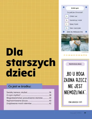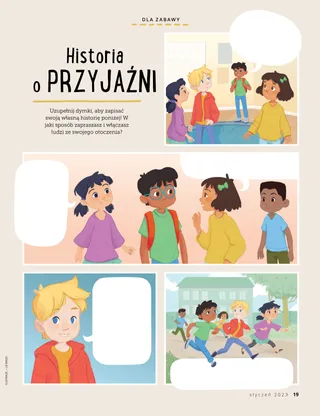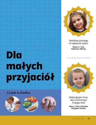 styczeń 2023 Drodzy PrzyjacielePrzeczytaj przesłanie na temat wspólnego naśladowania Jezusa. Korespondencyjni przyjacielePrzeczytajcie listy od naszych przyjaciół z całego świata! Dallin H. OaksJezus jest dla nas światłościąPrzeczytaj przesłanie Prezydenta Dallina H. Oaksa dotyczące Jezusa Chrystusa. Richard M. RomneyTyle hałasu!W domu Luke’a jest głośno, ale odnajduje on spokój w Jezusie Chrystusie. Przyjdź i naśladuj mnie Przyjdź i naśladuj mnie — zajęciaWykorzystaj te zajęcia do studiowania z rodziną programu Przyjdź i naśladuj mnie. Podróż do EgiptuPrzejdź labirynt, aby pomóc Marii, Józefowi i Jezusowi znaleźć drogę do Egiptu. Plan dla mnieWykonaj to ćwiczenie, aby dowiedzieć się więcej o swojej ścieżce przymierza. Jak Siedeh stała się odważnaKiedy Siedeh ma problemy w szkole, otrzymuje błogosławieństwo kapłańskie, które pomaga jej poczuć spokój i być odważną. Znajdź to!Czy potrafisz odnaleźć przedmioty ukryte na obrazku? W jaki sposób naśladujesz Jezusa?Wypełnij ten formularz i wyślij go do czasopisma Przyjaciel, aby powiedzieć nam, w jaki sposób naśladujesz Jezusa! Naśladowanie Jezusa w AngliiPoznaj Lucię, Vivie i Zaca z Anglii i dowiedz się, jak naśladują Jezusa. Pozdrowienia z Anglii!Pojedź na wycieczkę, aby dowiedzieć się więcej o Anglii! Susan H. PorterPomoc w dziele Ojca NiebieskiegoPrzeczytaj przesłanie Siostry Susan H. Porter na temat pomagania w dziele Ojca Niebieskiego. Historia o przyjaźniUzupełnij puste miejsca, aby napisać własną historię o przyjaźni. „Zmów modlitwę, Helamánie”Helamán daje przykład swoim przyjaciołom, modląc się przed lunchem w szkole. Wspaniała myślPlakat z przesłaniem: „Jezus jest prawdziwym światłem”. Matthew J. Neeley i Nola P. NeeleyJezus jest moim prawdziwym światłemNaucz się grać uproszczoną wersję pieśni „Jezus jest moim prawdziwym światłem”. Mogę czytać Nowy TestamentCzytaj wyznaczone wersety z Nowego Testamentu na każdy tydzień, a następnie pokoloruj odpowiednie miejsca. Łowienie rybCzy potrafisz odnaleźć przedmioty ukryte na obrazku? Wspólne naśladowanie JezusaZbiór wypowiedzi dzieci z całego świata. Jane McBrideWspominanie z babciąBabcia zapomina o wielu rzeczach, ale Mari uczy się być cierpliwa wobec niej i uczy się doceniać jej historie. Margo i PaoloPoznajcie Margo i Paolo oraz ich rodzinę w Brazylii! M. Russell BallardW jaki sposób twoja rodzina może pomagać sobie nawzajem?Przeczytaj przesłanie Prezydenta M. Russella Ballarda na temat pomagania swojej rodzinie. Dla starszych dzieci Dla starszych dzieciSpis treści do części: Dla starszych dzieci Sandra EdwardsŚwiatła, kamera, służba!Podczas pandemii COVID-19 Antonella i Mariana kręcą filmy do podręcznika Przyjdź i naśladuj mnie w języku hiszpańskim. O czym myślisz?Wytnij tę kartkę i czytaj te fragmenty pism świętych, kiedy tylko potrzebujesz więcej siły. Błogosławieństwo: poszukiwanie skarbówZagrajcie w tę grę, abyście byli wdzięczni za to, co dał wam Ojciec Niebieski. Mikaela WilkinsReprezentowanie JezusaDavid przygotowuje się, aby mógł reprezentować Jezusa, kiedy roznosi sakrament. Fruean P.Znajdowanie moich talentówPrzeczytaj o tym, jak Fruean P. rozwinął swoje talenty dzięki programowi Dzieci i młodzież. Dla małych przyjaciół Dla małych przyjaciółPoznajcie kilkoro małych przyjaciół z całego świata. Mogę naśladować Jezusa Chrystusa, modląc sięDowiedz się, w jaki sposób możesz naśladować Jezusa, modląc się. Dary dla JezusaPrzeczytaj historię o tym, jak mędrcy przynieśli dary Jezusowi Chrystusowi. Biblia naucza o JezusieNauczaj swoje maluchy przy pomocy kolorowanki o tematyce związanej z ewangelią. W tym miesiącu przesłanie brzmi: „Biblia naucza o Jezusie”. Przyjdź i naśladuj mnie Zajęcia dla dzieciWykorzystaj te zajęcia do studiowania podręcznika Przyjdź i naśladuj mnie z najmłodszymi. Drodzy Rodzice,Przeczytajcie przesłanie na temat znajdowania pokoju w Chrystusie.