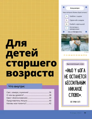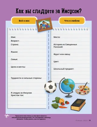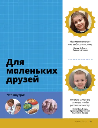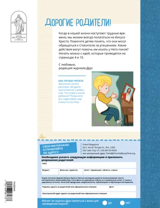 Январь 2023 Дорогие друзьяПрочитайте послание о том, как следовать за Иисусом вместе. Друзья по перепискеПрочитайте несколько писем от наших друзей по всему миру! Даллин Х. ОуксИисус – наш светПрочитайте послание президента Даллина Х. Оукса об Иисусе Христе. Ричард М. РомниКак же шумно!Дома у Луки шумно, но он находит покой в Иисусе Христе. Приходи, следуй за Мною Задания по учебному плану Приходи, следуй за МноюЭти задания и идеи помогут вам изучать материалы Приходи, следуй за Мною с семьей. Бегство в ЕгипетПройдите по лабиринту, чтобы помочь Марии, Иосифу и Иисусу отыскать путь в Египет. План для меняВыполните задание, чтобы узнать о своем пути заветов. Как Сида стала храбройКогда у Сиды возникают проблемы в школе, она получает благословение священства, которое помогает ей ощутить покой и стать храброй. Найдите!Сможете ли вы найти на картинке спрятанные предметы? Как вы следуете за Иисусом?Заполните эту анкету о том, как вы следуете за Иисусом, и пришлите ее в редакцию журнала «Друг»! Следуем за Иисусом в АнглииПознакомьтесь с Люсией, Виви и Заком из Англии и узнайте, как они следуют за Иисусом. Привет из Англии!Отправляйтесь с нами в путешествие, чтобы больше узнать об Англии! Сьюзен Х. ПортерУчаствуем в деле Небесного ОтцаПрочитайте послание сестры Сьюзен Х. Портер об участии в деле Небесного Отца. История о дружбеЗаполните пробелы, чтобы у вас получилась история о дружбе. «Помолись, Геламан»Геламан показывает пример своим друзьям, молясь перед обедом в школе. Важная мысльПлакат с посланием «Иисус – истинный Свет». Мэтью Дж. Нили и Нола П. НилиСвет Иисуса горитНаучитесь играть упрощенную версию песни «Свет Иисуса горит». Я могу читать Новый ЗаветКаждую неделю читайте стихи из Нового Завета и закрашивайте соответствующие клеточки. Ловим рыбуСможете ли вы найти на картинке спрятанные предметы? Следуем за Иисусом вместеКоллекция детских высказываний со всего мира. Джейн МакбрайдБабушка и памятьБабушка многое забывает, но Мари учится проявлять к ней терпение и быть благодарной за ее рассказы. Марго и ПаулоПознакомьтесь с Марго и Пауло и их семьей в Бразилии! М. Рассел БаллардКак мы можем помогать друг другу в семье?Прочитайте послание президента М. Рассела Балларда о помощи близким. Для детей старшего возраста Для детей старшего возрастаСодержание раздела для детей старшего возраста Сандра ЭдвардсСвет, камера, служение!Во время пандемии коронавирусной инфекции Антонелла и Мариана снимают видеосюжеты Приходи, следуй за Мною на испанском языке. О чем вы думаете?Вырежьте эту карточку и читайте эти отрывки из Священных Писаний каждый раз, когда вам нужны свежие силы. Квест «Благословения»Пройдите квест «Благословения», чтобы ощутить благодарность за то, что вам дает Небесный Отец. Микаэла УилкинсПредставитель ИисусаДэвид готовится быть представителем Иисуса во время прислуживания причастия. Фруин П.Каковы мои таланты?Прочитайте о том, как Фруин П. развил в себе таланты благодаря программе «Дети и молодежь». Для маленьких друзей Для маленьких друзейПознакомьтесь с несколькими маленькими друзьями со всего мира. Я могу следовать за Иисусом Христом, молясь БогуУзнайте, как можно следовать за Иисусом Христом, молясь Богу. Подарки для ИисусаПрочитайте рассказ о том, как волхвы принесли дары Иисусу Христу. Библия рассказывает