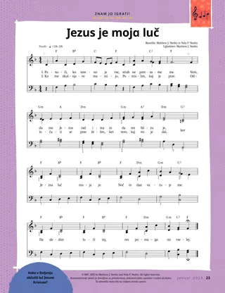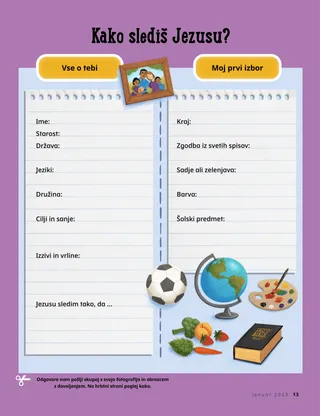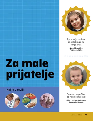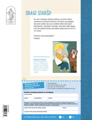 januar 2023 Dragi prijateljiPreberite sporočilo o tem, kako Jezusu lahko sledite skupaj. Dopisni prijateljiPreberi nekaj pisem naših prijateljev po svetu! Dallin H. OaksJezus je naša lučPreberi sporočilo predsednika Dallina H. Oaksa o Jezusu Kristusu. Richard M. RomneyTako hrupno!Pri Luku doma je hrupno, a najde mir v Jezusu Kristusu. Pridi in hodi za menoj Dejavnosti iz priročnika Pridi in hodi za menojZ družino pri proučevanju lekcij v učbeniku Pridi in hodi za menoj uporabite naslednje dejavnosti. Potovanje v EgiptMariji, Jožefu in Jezusu v labirintu pomagaj najti pot v Egipt. Načrt zameS pomočjo dejavnosti spoznaj svojo pot zavez. Kako je Siedeh postala pogumnaKo ima Siedeh težave v šoli, dobi duhovniški blagoslov in to ji pomaga, da občuti mir in je pogumna. Poišči!Ali lahko najdeš skrite predmete na sliki? Kako slediš Jezusu?Izpolni obrazec in ga pošlji Prijatelju, da nam boš povedal, kako slediš Jezusu! V Angliji hodimo za JezusomSpoznajte Lucio, Vivie in Zaca iz Anglije in jim prisluhnite, kako sledijo Jezusu. Pozdrav iz Anglije!Podaj se na izlet, da boš spoznaval Anglijo! Susan H. PorterNebeškemu Očetu pomagam pri deluPreberi sporočilo sestre Susan H. Porter o tem, kako nebeškemu Očetu pomagamo pri delu. Zgodba o prijateljstvuIzpolni prazna polja in napiši svojo zgodbo o prijateljstvu. »Izreci molitev, Helaman!«Helaman je vzor prijateljem, tako da pred malico v šoli moli. Bistra zamiselPlakat s sporočilom »Jezus je resnična luč«. Matthew J. Neeley in Nola P. NeeleyJezus je moja resnična luč.Nauči se igrati preprosto inačico hvalnice »Jezus je moja resnična luč«. Lahko berem Novo zavezoVsak teden preberi izbrane verze iz Nove zaveze, nato pobarvaj ustrezna polja. RibolovAli lahko najdeš skrite predmete na sliki? Skupaj sledimo JezusuZbirka otroških misli z vsega sveta Jane McBrideSpominjam se z babicoBabica veliko stvari pozabi, a Mari se uči, da je do nje potrpežljiva in da je njenih zgodb vesela. Margo in PaoloSpoznaj Margo in Paola in njuno družino v Braziliji! M. Russell BallardKako v družini lahko pomagate drug drugemu?Preberi sporočilo predsednika M. Russella Ballarda o tem, kako lahko pomagaš svoji družini. Za starejše otroke Za starejše otrokeVsebinsko kazalo za rubriko Za starejše otroke Sandra EdwardsLuči, kamera, služenje!Antonella in Mariana med pandemijo covida-19 posnameta videe lekcij iz priročnika Pridi in hodi za menoj v španščini. O čem premišljuješ?Kartico izreži in ko potrebuješ dodatno moč, preberi odlomek iz svetih spisov na njej. Blagoslov lova za zakladomS pomočjo blagoslovov lova za zakladom boste hvaležni za to, kar vam daje nebeški Oče. Mikaela WilkinsZastopam JezusaDavid se pripravi, da takrat, ko razdeljuje zakrament, lahko zastopa Jezusa. Fruean P.Odkrivam svoje talentePreberite, kako je Fruean P. razvijal svoje talente preko s programom za otroke in mladino. Za male prijatelje Za male prijateljeSpoznaj nekaj malih prijateljev z vsega sveta. Jezusu lahko sledim tako, da molimSpoznaj, kako Jezusu lahko slediš tako, da moliš. Darila za JezusaPreberite zgodbo o tem, kako so modreci Jezusu Kristusu prinesli darila. Sveto pismo uči o JezusuSvoje najmlajše učite z evangelijsko pobarvanko. Sporočilo tega meseca je: »Sveto pismo uči o Jezusu.« Dejavnosti za najmlajše iz priročnika Pridi in hodi za menojZ najmlajšimi pri preučevanju lekcij v priročniku Pridi in hodi za menoj uporabite naslednje dejavnosti. Dragi starši!Preberite sporočilo za starše, kako v Jezusu Kristusu lahko najdemo mir.