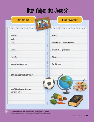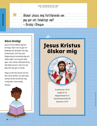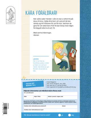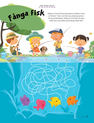 Januari 2023 Kära vännerLäs ett budskap om att följa Jesus tillsammans. Vänner per postLäs post från våra vänner runt om i världen! Dallin H. OaksJesus är vårt ljusLäs ett budskap från president Dallin H. Oaks om Jesus Kristus. Richard M. RomneySå mycket oväsen!Det är så mycket oväsen i Lukas hus, men han finner frid i Jesus Kristus. Kom och följ mig Aktiviteter för Kom och följ migAnvänd de här aktiviteterna för att studera Kom och följ mig med din familj. Resan till EgyptenGå igenom labyrinten för att hjälpa Maria, Josef och Jesus hitta vägen till Egypten. En plan för migGör aktiviteten för att lära dig om din förbundsstig. Hur Siedeh blev modigNär Siedeh har problem i skolan får hon en prästadömsvälsignelse och den hjälper henne att känna frid och vara modig. Hitta dem!Kan du hitta de gömda sakerna i bilden? Hur följer du Jesus?Fyll i den här blanketten och skicka den till Vännen för att berätta hur du följer Jesus! Vi följer Jesus i EnglandMöt Lucia, Vivie och Zac från England och lär dig hur de följer Jesus. Hej från England!Res i väg för att lära dig mer om England! Susan H. PorterHjälpa till med vår himmelske Faders verkLäs ett budskap från syster Susan H. Porter om att hjälpa till med vår himmelske Faders verk. En berättelse om vänskapFyll i de tomma raderna och skriv en egen berättelse om vänskap. ”Be en bön, Helamán”Helamán är ett exempel för sina vänner genom att välsigna maten i skolan. Bra idéEn affisch med budskapet: ”Jesus är det sanna ljuset.” Matthew J.Neeley och Nola P. NeeleyJesus Is My True LightLär dig spela en förenklad version av ”Jesus Is My True Light”. Jag kan läsa Nya testamentetLäs verserna i Nya testamentet för varje vecka och färglägg sedan de matchande delarna på bilderna. Fånga fiskKan du hitta de gömda sakerna i bilden? Vi följer Jesus tillsammansEn samling av citat från barn runt om i världen. Jane McBrideAtt minnas med farmorFarmor glömmer mycket, men Mari lär sig att ha tålamod med henne och uppskatta hennes berättelser. Margo och PaoloMöt Margo och Paolo och deras familj i Brasilien! M. Russell BallardHur kan din familj hjälpa varandra?Läs ett budskap från president M. Russell Ballard om att hjälpa din familj. För äldre barn För äldre barnInnehållsförteckning för avsnittet För äldre barn Sandra EdwardsLjus, kamera, tjänande!Under covid-19-pandemin gjorde Antonella och Mariana videor för Kom och följ mig på spanska. Vad funderar du på?Klipp ut det här kortet och läs skriftställena när du behöver extra styrka. Skattjakt om välsignelserGör den här skattjakten om välsignelser för att hjälpa dig vara tacksam för det som din himmelske Fader har gett dig. Mikaela WilkinsAtt representera JesusDavid förbereder sig så att han kan representera Jesus när han delar ut sakramentet. Fruean P.Hitta mina talangerLäs om hur Fruean P. utvecklade sina talanger genom programmet Barn och ungdomar. För små vänner För små vännerMöt några små vänner från hela världen. Jag kan följa Jesus genom att beLär dig hur du kan följa Jesus genom att be. Gåvor till JesusLäs en berättelse om hur de vise männen tog med sig gåvor till Jesus Kristus. Bibeln undervisar om JesusUndervisa era små med en evangeliecentrerad färgläggningssida. Månadens budskap är: ”Bibeln undervisar om Jesus.” Aktiviteter för Kom och följ mig för de småAnvänd de här aktiviteterna när ni studerar Kom och följ mig med era små. Kära föräldrarLäs ett budskap till föräldrar om att finna frid i Jesus Kristus.