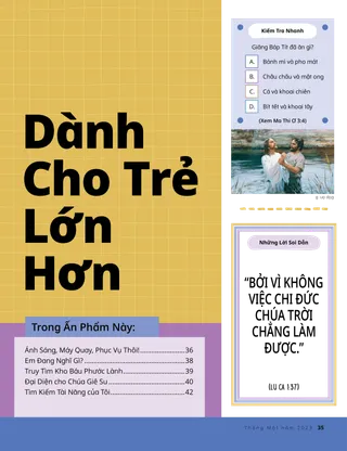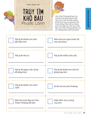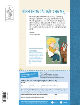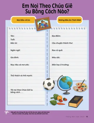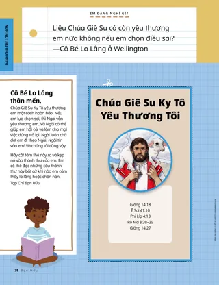 Tháng Một năm 2023 Các Bạn Nhỏ Thân MếnHãy đọc một sứ điệp về việc cùng nhau noi theo Chúa Giê Su. Bạn Hữu qua ThưHãy đọc một vài bức thư từ những bạn bè trên khắp thế giới của chúng ta! Dallin H. OaksChúa Giê Su Là Sự Sáng của Chúng TaHãy đọc một sứ điệp từ Chủ Tịch Dallin H. Oaks về Chúa Giê Su Ky Tô. Richard M. RomneyỒn Ào Quá!Nhà của Luke ồn ào lắm, nhưng em ấy đã tìm thấy bình an trong Chúa Giê Su Ky Tô. Hãy Đến Mà Theo Ta Các Sinh Hoạt Hãy Đến Mà Theo TaHãy sử dụng các sinh hoạt này để học tập Hãy Đến Mà Theo Ta cùng với gia đình của các em. Hành Trình đến Ai CậpHãy đi theo mê cung để giúp Ma Ri, Giô Sép và em bé Giê Su tìm đường đến Ai Cập. Kế Hoạch dành cho TôiHãy thực hiện sinh hoạt này để tìm hiểu về con đường giao ước của em. Siedah Trở Nên Dũng Cảm Như Thế NàoKhi Siedah gặp khó khăn ở trường, cô bé đã nhận được một phước lành chức tư tế và điều đó giúp cô bé cảm thấy bình an và dũng cảm. Hãy Tìm Kiếm Nào!Em có thể tìm ra các vật đang được giấu trong bức tranh không? Em Noi Theo Chúa Giê Su Bằng Cách Nào?Hãy điền vào đơn này và gửi cho Tạp Chí Bạn Hữu để chúng tôi biết về cách em noi theo Chúa Giê Su! Noi Theo Chúa Giê Su tại Anh QuốcHãy cùng gặp Lucia, Vivie, và Zac đến từ Anh Quốc và tìm hiểu cách mà các bạn ấy noi theo Chúa Giê Su. Lời Chào từ Anh Quốc!Hãy cùng tham gia một chuyến đi tìm hiểu về Anh Quốc! Susan H. PorterGiúp Đỡ Công Việc của Cha Thiên ThượngHãy đọc một sứ điệp từ Chị Susan H. Porter về việc giúp đỡ công việc của Cha Thiên Thượng. Một Câu Chuyện về Tình BạnHãy điền vào chỗ trống để viết nên một câu chuyện của chính em về tình bạn. “Helamán Ơi, Hãy Cầu Nguyện Đi”Helamán làm gương cho bạn của mình bằng cách cầu nguyện trong bữa trưa ở trường. Ý Kiến Thật HayMột tấm áp phích với thông điệp, “Chúa Giê Su là sự sáng thật.” Matthew J. Neeley và Nola P. NeeleyGiê Su là Sự Sáng ThậtHọc cách chơi phiên bản đơn giản của bài hát “Giê Su là Sự Sáng Thật.” Tôi Có Thể Đọc Kinh Tân ƯớcHãy đọc các câu thánh thư trong Kinh Tân Ước mỗi tuần và sau đó tô màu vào các khoảng trống tương ứng. Câu CáCác em có thể tìm ra các vật đang được giấu trong bức tranh không? Cùng Nhau Noi Theo Chúa Giê SuMột bộ sưu tập các câu trích dẫn của các bạn thiếu nhi từ khắp nơi trên thế giới. Jane McBrideLuyện Trí Nhớ với BàBà quên rất nhiều thứ, nhưng Mari học được cách kiên nhẫn với bà và trân trọng những câu chuyện của bà. Margo và PaoloHãy gặp gỡ Margo và Paolo cùng gia đình của họ ở Brazil! M. Russell BallardGia Đình Em Có Thể Giúp Đỡ Lẫn Nhau Như Thế Nào?Hãy đọc một sứ điệp từ Chủ Tịch M. Russell Ballard về cách giúp đỡ gia đình em. Dành Cho Trẻ Lớn Hơn Dành Cho Trẻ Lớn HơnMục lục của phần Dành Cho Trẻ Lớn Hơn Sandra EdwardsÁnh Sáng, Máy Quay, Phục Vụ Thôi!Trong thời gian đại dịch COVID-19, Antonella và Mariana đã tạo ra các video Hãy Đến Mà Theo Ta bằng tiếng Tây Ban Nha. Em Đang Nghĩ Gì?Hãy cắt tấm thẻ này ra và đọc thánh thư bất cứ khi nào em cần thêm sức mạnh. Truy Tìm Kho Báu Phước LànhHãy thực hiện sinh hoạt truy tìm kho báu phước lành này để giúp em biết ơn những gì Cha Thiên Thượng đã ban cho em. Mikaela WilkinsĐại Diện cho Chúa Giê SuDavid chuẩn bị bản thân để có thể đại diện cho Chúa Giê Su khi truyền Tiệc Thánh. Fruean P.Tìm Kiếm Tài Năng của TôiHãy đọc về cách mà Fruean P. phát triển tài năng của mình thông qua chương trình Trẻ Em và Giới Trẻ. Dành Cho Các Bạn Nhỏ Dành Cho Các Bạn NhỏGặp gỡ một số bạn nhỏ từ khắp nơi trên thế giới. Tôi Có Thể Noi Theo Chúa Giê Su bằng Việc Cầu NguyệnHãy tìm hiểu cách noi theo chúa giê su bằng việc cầu nguyện. Những Món Quà dành cho Chúa Giê SuHãy đọc câu chuyện về cách Những Nhà Thông Thái mang quà đến tặng Chúa Giê Su Ky Tô. Kinh Thánh Dạy về Chúa Giê SuHãy dạy cho các con của anh chị em qua một trang tô màu có nội dung về phúc âm. Sứ điệp của tháng này, “Kinh Thánh dạy về Chúa Giê Su.” Hãy Đến Mà Theo Ta Sinh Hoạt dành cho Trẻ NhỏHãy sử dụng các sinh hoạt này để học Hãy Đến Mà Theo Ta cùng với con cái của anh chị em. Kính Thưa Các Bậc Cha MẹHãy đọc một sứ điệp cho các bậc cha mẹ về việc tìm kiếm sự bình an trong Chúa Giê Su Ky Tô.