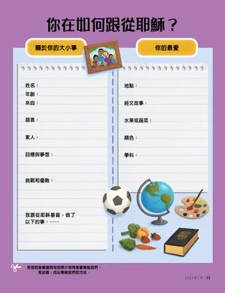 2023年1月 親愛的朋友一起閱讀一則關於跟從耶穌的信息。 朋友天地閱讀來自世界各地朋友的郵件! 達林·鄔克司耶穌是我們的光閱讀達林·鄔克司會長有關耶穌基督的信息。 理查·羅慕義太吵了!路加的家裡很吵,但他在耶穌基督裡找到平安。 來跟從我 來跟從我活動運用這些活動,和家人一起研讀來跟從我。 埃及之行沿著迷宮,幫助馬利亞、約瑟和耶穌找出前往埃及的路。 一個為我制定的計畫進行這項活動,了解你的聖約道路。 希達如何變得勇敢當希達在學校遇到麻煩時,她得到了一個聖職祝福,這讓她感到平安並且勇敢起來。 找找看!你能在圖片中找出隱藏的物件嗎? 你在如何跟從耶穌?填寫此表格,寄給朋友雜誌,告訴我們你如何跟從耶穌! 在英格蘭跟從耶穌認識英格蘭的露西亞、薇薇和札克,了解他們如何跟從耶穌。 來自英格蘭的問候!來一次了解英格蘭的旅行吧! 蘇珊·波特協助天父的事工閱讀蘇珊·波特姊妹關於協助天父事工的信息。 友誼的故事填寫空白處,寫下你自己的友誼故事。 「作個禱告吧,希拉曼」希拉曼在學校作午餐祈禱,為他的朋友樹立了榜樣。 福音靈光海報信息:「耶穌是真光。」 馬太·尼里和諾拉·尼里主耶穌是真光學習彈奏簡易版的「主耶穌是真光」。 我會讀新約每週讀幾節新約經文,然後在相對應的空白處著色。 捕魚你能在圖片中找出隱藏的物件嗎? 一同跟從耶穌來自世界各地兒童的話語。 珍·麥克布萊和奶奶一起回憶奶奶忘記很多事,但瑪莉學會了要對她有耐心,並珍惜她的故事。 瑪歌和保羅認識瑪歌和保羅以及他們在巴西的家人! 羅素·培勒你的家人可以如何互相幫助?閱讀羅素·培勒會長的信息,了解如何幫助你的家人。 大孩子園地 大孩子園地大孩子園地單元的目錄 珊卓拉·愛德華茲燈光、攝影、服務!在2019冠狀病毒病疫情期間,安東娜拉和瑪莉安娜製作西班牙語的來跟從我影片。 你在想什麼?剪下這張卡片,每當你需要更多力量時,就讀一讀這些經文。 祝福尋寶遊戲進行這項祝福尋寶遊戲,幫助你感謝天父賜給你的一切。 米凱拉·威金斯代表耶穌大衛準備好自己,以便能在傳遞聖餐時代表耶穌。 弗魯安發現我的才能閱讀弗魯安的故事,了解他如何透過兒童和青少年計畫培養才能。 幼兒園地 幼兒園地認識世界各地的小朋友們。 我能透過祈禱來跟從耶穌學習如何透過祈禱來跟從耶穌。 給耶穌的禮物閱讀一則有關博士如何帶禮物給耶穌基督的故事。 聖經教導有關耶穌的事用以福音為主的著色頁來教導小小孩。這個月的信息是:「聖經教導有關耶穌的事。」 小小孩的來跟從我活動運用這些活動,和小小孩一起學習來跟從我。 親愛的父母閱讀給父母的信息,了解如何在耶穌基督裡找到平安。