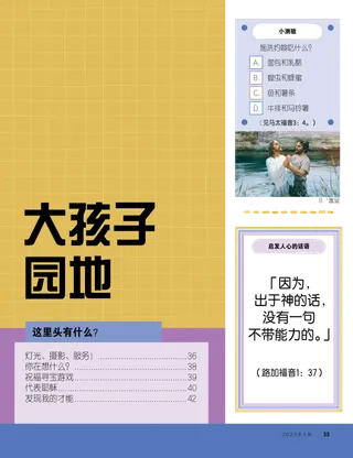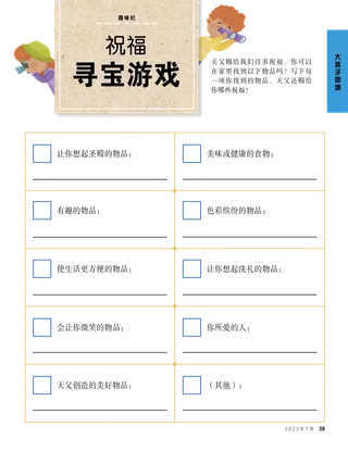 2023年1月 亲爱的朋友一起阅读一则关于跟从耶稣的信息。 朋友天地阅读来自世界各地朋友的邮件! 达林·邬克司耶稣是我们的光阅读达林·邬克司会长有关耶稣基督的信息。 理查·罗慕义太吵了!路加的家里很吵,但他在耶稣基督里找到平安。 来跟从我 来跟从我活动运用这些活动,和家人一起研读来跟从我。 埃及之行沿着迷宫,帮助马利亚、约瑟和耶稣找出前往埃及的路。 一个为我制定的计划进行这项活动,了解你的圣约道路。 希达如何变得勇敢当希达在学校遇到麻烦时,她得到了一个圣职祝福,这让她感到平安并且勇敢起来。 找找看!你能在图片中找出隐藏的物件吗? 你在如何跟从耶稣?填写此表格,寄给朋友杂志,告诉我们你如何跟从耶稣! 在英格兰跟从耶稣认识英格兰的露西亚、薇薇和札克,了解他们如何跟从耶稣。 来自英格兰的问候!来一次了解英格兰的旅行吧! 苏珊·波特协助天父的事工阅读苏珊·波特姊妹关于协助天父事工的信息。 友谊的故事填写空白处,写下你自己的友谊故事。 「作个祷告吧,希拉曼」希拉曼在学校作午餐祈祷,为他的朋友树立了榜样。 福音灵光海报信息:「耶稣是真光。」 马太·尼里和诺拉·尼里主耶稣是真光学习弹奏简易版的「主耶稣是真光」。 我会读新约每周读几节新约经文,然后在相对应的空白处着色。 捕鱼你能在图片中找出隐藏的物件吗? 一同跟从耶稣来自世界各地儿童的话语。 珍·麦克布莱和奶奶一起回忆奶奶忘记很多事,但玛莉学会了要对她有耐心,并珍惜她的故事。 玛歌和保罗认识玛歌和保罗以及他们在巴西的家人! 罗素·培勒你的家人可以如何互相帮助?阅读罗素·培勒会长的信息,了解如何帮助你的家人。 大孩子园地 大孩子园地大孩子园地单元的目录 珊卓拉·爱德华兹灯光、摄影、服务!在2019冠状病毒病疫情期间,安东娜拉和玛莉安娜制作西班牙语的来跟从我影片。 你在想什么?剪下这张卡片,每当你需要更多力量时,就读一读这些经文。 祝福寻宝游戏进行这项祝福寻宝游戏,帮助你感谢天父赐给你的一切。 米凯拉·威金斯代表耶稣大卫准备好自己,以便能在传递圣餐时代表耶稣。 弗鲁安发现我的才能阅读弗鲁安的故事,了解他如何透过儿童和青少年计划培养才能。 幼儿园地 幼儿园地认识世界各地的小朋友们。 我能透过祈祷来跟从耶稣学习如何透过祈祷来跟从耶稣。 给耶稣的礼物阅读一则有关博士如何带礼物给耶稣基督的故事。 圣经教导有关耶稣的事用以福音为主的着色页来教导小小孩。这个月的信息是:「圣经教导有关耶稣的事。」 小小孩的来跟从我活动运用这些活动,和小小孩一起学习来跟从我。 亲爱的父母阅读给父母的信息,了解如何在耶稣基督里找到平安。