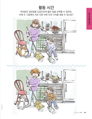 나는 옳은 일을 선택함으로써 예수님을 따를 수 있어요 나는 친절을 선택할 수 있어요. 나는 정직할 수 있어요. 나는 가족과 함께 경전을 읽을 수 있어요. 나는 부모님이 부탁하신 일을 할 수 있어요. 활동 시간 여러분은 집안일을 도움으로써 옳은 일을 선택할 수 있어요. 아래 두 그림에서 서로 다른 부분 다섯 가지를 찾을 수 있나요? 삽화: 엘리스 블랙