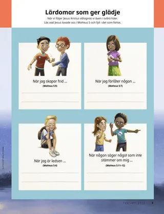 När vi följer Jesus Kristus välsignas vi även i svåra tider. Läs vad Jesus lovade oss i Matteus 5 och fyll i det som fattas.