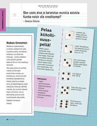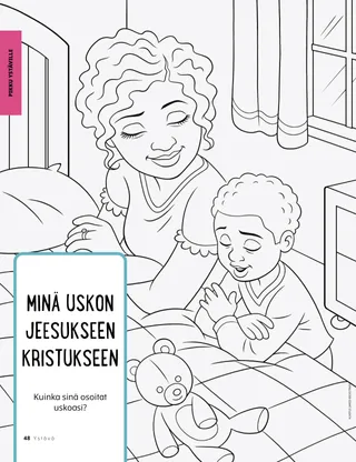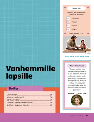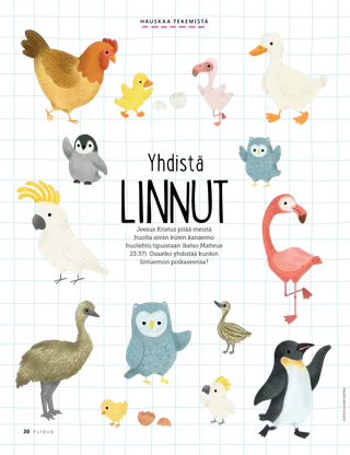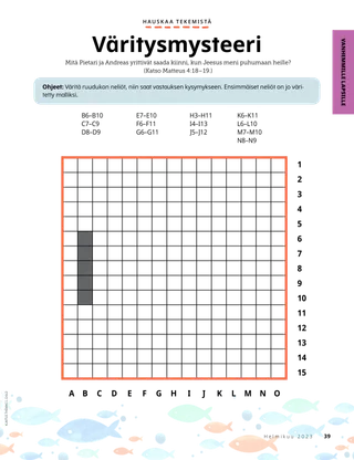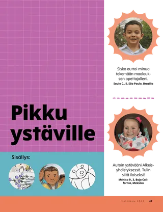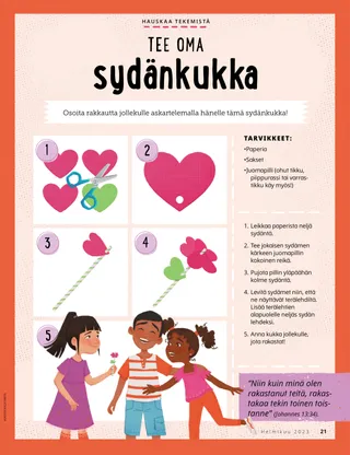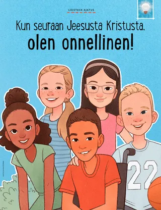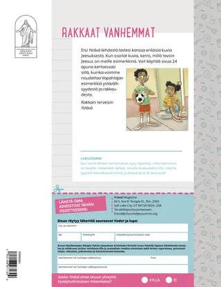 Helmikuu 2023 Rakkaat ystävätLue sanoma siitä, kuinka kohdella ihmisiä ystävällisesti ja kuinka suhtautua kiusaamiseen. Ystävät muuallaLue postia ystäviltämme eri puolilta maailmaa! Russell M. NelsonKuinka löydän iloaLue presidentti Russell M. Nelsonin sanoma siitä, kuinka voimme löytää iloa. Ray GoldrupKaksitoista hymynaamatarraaAntonio alkaa tehdä ystävällisiä tekoja, kun Alkeisyhdistyksen opettaja haastaa hänet saamaan ihmiset hymyilemään. Tule ja seuraa minua Tule ja seuraa minua – tekemistäKäytä näitä tehtäviä, kun tutkitte perheenne kanssa Tule ja seuraa minua -aineistoa. Tähtää pyhiin kirjoituksiinPelatkaa hauskaa peliä, jonka aiheena ovat pyhät kirjoitukset! KasteOpi liittopolustasi, joka johtaa takaisin taivaallisen Isän luo. Maryssa DennisVanhoja ja uusia ystäviäKun Lea menettää koulussa ystävän, taivaallinen Isä auttaa häntä. Isaac E.Jalkapalloilijan valintaIsaac E. kertoo, kuinka hän päätti pyhittää lepopäivän. Etsi!Löydätkö tähän kuvaan piilotetut esineet? Mikaela WilkinsIsoja juttujaBeckham kertoo pieniä valheita ja oppii, että totuuden kertominen on paras vaihtoehto. Jeesuksen jalanjäljissä RuotsissaTutustu Linnéaan, Feliciaan ja Ceciliaan Ruotsista ja ota selvää, kuinka he seuraavat Jeesusta. Tervehdys Ruotsista!Lähde matkaan ja tutustu Ruotsiin! Jeffrey R. HollandMitä evankeliumi opettaa rakkaudesta?Lue vanhin Jeffrey R. Hollandin sanoma siitä, kuinka Jumala opettaa meitä rakastamaan. Tee oma sydänkukkaTee sydänaiheinen askartelutyö, jonka voit antaa jollekulle. Gayle Kinney-CorneliusYstäviä välitunnillaJason löytää koulusta ystäviä, jotka pitävät samoista asioista kuin hän. Minä voin puolustaa muitaOpi, kuinka Jeesus Kristus puolusti muita ja osoitti ystävällisyyttä. Yhdessä Jeesuksen jalanjäljissäKokoelma lasten ajatuksia ympäri maailman. Lucy Stevenson EwellKananmunasotkuSasha ja Alfred leikkivät kananmunilla ja saavat aikaan ison sotkun, mutta he päättävät olla rehellisiä. Yhdistä linnutPelaa yhdistämispeliä, joka muistuttaa, että Jeesus Kristus välittää meistä. Loistava ajatusJuliste, jossa on viesti: ”Kun seuraan Jeesusta Kristusta, olen onnellinen!” Vaiangina SikahemaOnko Jumala siellä?Lue vanhin Vaiangina Sikaheman sanoma siitä, kuinka hänet sinetöitiin perheeseensä temppelissä lapsena. Margo ja PaoloPaoloa jännittää mennä uuteen Alkeisyhdistyksen luokkaan, mutta Margo rohkaisee häntä. Vanhemmille lapsille Vanhemmille lapsilleVinkkejä ja tehtäviä vanhemmille lapsille. Juliann Tenney DomanOnnenviestiRiley tekee ystäviensä kanssa ystävällisen teon uudelle opettajalle, jotta tämä tuntisi olevansa tervetullut kouluun. Mitä on mielessäsi?Lue, kuinka kiitollisuus voi auttaa sinua tuntemaan itsesi onnellisemmaksi. VäritysmysteeriVäritä ruudut, niin löydät vastauksen kysymykseen. Zoila Rosa Trelles AraujoMarcon uusi tehtävä kirkossaMarco kutsutaan seurakuntansa sukututkimusneuvojaksi, ja hän oppii tekemään sukututkimustyötä. Kaikkein tärkeimmät asiatTee tämä tehtävä, joka auttaa sinua asettamaan lasten ja nuorten ohjelman tavoitteita. Pikku ystäville Pikku ystävilleTutustu muutamiin pikku ystäviimme eri puolilta maailmaa. Minä voin seurata Jeesusta valitsemalla oikeinKatso, kuinka voit seurata Jeesusta valitsemalla oikein. Jeesus parantaa naisenLue kertomus siitä, kuinka Jeesus paransi erään naisen. Uskon Jeesukseen KristukseenOpeta pieniä lapsiasi evankeliumiin liittyvän värityskuvan avulla. Tämän kuukauden sanoma on: ”Minä uskon Jeesukseen Kristukseen.” Tule ja seuraa minua -tehtäviä pikkuystävilleKäytä näitä tehtäviä tutkiessasi Tule ja seuraa minua -aineistoa pienten lastesi kanssa. Rakkaat vanhemmatLue sanoma vanhemmille rauhan löytämisestä Kristuksessa.