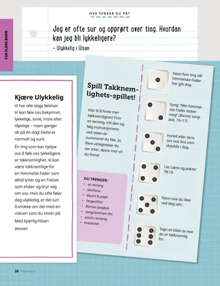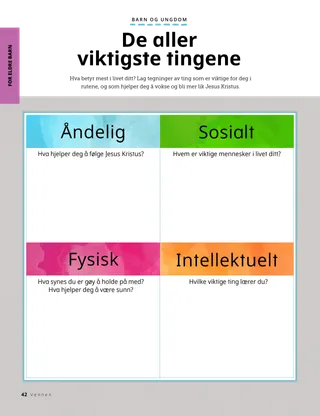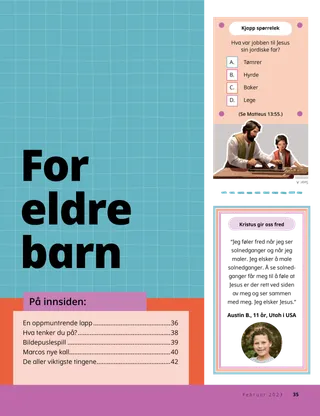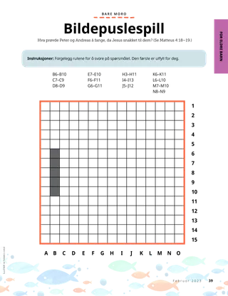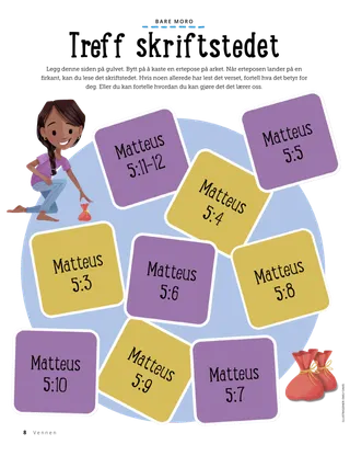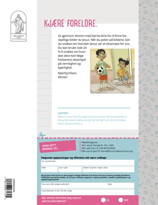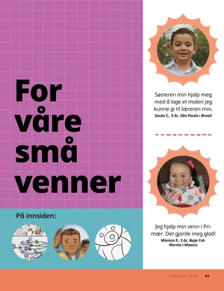 Februar 2023 Kjære vennerLes et budskap om å behandle mennesker vennlig og takle mobbing. Venner via postLes litt post fra våre venner rundt om i verden! Russell M. NelsonHvordan finne gledeLes et budskap fra president Russell M. Nelson om hvordan å finne glede Ray GoldrupTolv smilefjesAntonio gjør gode ting for folk etter å ha blitt utfordret av primærlæreren sin til å få folk til å smile. Kom, følg med meg Kom, følg med meg-aktiviteterBruk disse aktivitetene til å studere Kom, følg med meg sammen med familien. Treff skriftstedetLek et morsomt skriftsted-spill! DåpLær om din pakts sti tilbake til vår himmelske Fader. Maryssa DennisVenner som er tapt og funnet igjenNår Leah mister en venn på skolen, hjelper vår himmelske Fader henne. Isaac E.Fotball-valgetIsaac E. forteller hvordan han valgte å holde sabbatsdagen hellig. Finn den!Kan du finne gjenstandene som er skjult på bildet? Mikaela WilkinsStore historierBeckham forteller noen små løgner og lærer at å si sannheten er det beste valget. Følger Jesus i SverigeMøt Linnéa, Felicia, og Cecilia og lær om hvordan de følger Jesus. Hei fra Sverige!Ta en tur for å lære om Sverige! Jeffrey R. HollandHva lærer evangeliet oss om kjærlighet?Les et budskap fra eldste Jeffrey R. Holland om hvordan Gud lærer oss å vise kjærlighet. Lag Din Egen HjerteblomstLag noe med hjerte-tema som du kan dele med noen. Gayle Kinney-CorneliusVenner i friminuttetJason får venner på skolen som liker det samme som ham. Jeg kan stille opp for andreLær om hvordan Jesus Kristus stilte opp for andre og viste vennlighet. Følger Jesus sammenEn samling barnesitater fra forskjellige steder i verden. Lucy Stevenson EwellEggsølSasha og Alfred leker med noen egg og bommer skikkelig, men de velger å være ærlige. Sett fuglene sammenSpill et memospill for å huske hvordan Jesus Kristus bryr seg om oss. En lys idéEn plakat med budskapet: “Når jeg følger Jesus Kristus, er jeg lykkelig!” Vaiangina SikahemaEr Gud der inne?Les et budskap fra eldste Vaiangina Sikahema om hvordan han som barn ble beseglet til familien sin i tempelet. Margo og PaoloPaolo er nervøs for å gå til sin nye Primær-klasse, men Margo hjelper ham å føle seg bedre. For eldre barn For eldre barnTips og aktiviteter for eldre barn. Juliann Tenney DomanEn oppmuntrende lappRiley og vennene hennes gjør noe hyggelig for den nye læreren så han skal føle seg velkommen på skolen. Hva tenker du på?Les om hvordan takknemlighet kan hjelpe deg til å føle deg lykkeligere. BildepuslespillFullfør puslespillet for å finne svar på spørsmålet. Zoila Rosa Trelles AraujoMarcos nye kallMarco blir kalt som slektshistorisk konsulent i menigheten og lærer å gjøre slektshistorisk arbeid. De aller viktigste tingeneGjør denne aktiviteten for å få hjelp til å velge mål for programmet Barn og ungdom. For våre små venner For våre små vennerMøt noen små venner fra forskjellige steder i verden. Jeg kan følge Jesus ved å velge det retteLær om hvordan du kan følge Jesus ved å velge det rette. Jesus helbreder en kvinneLes en historie om hvordan Jesus helbredet en kvinne. Jeg tror på Jesus Kristus.Undervis de små med en evangeliesentrert fargeleggingsside. Denne månedens budskap er: “Jeg tror på Jesus Kristus.” Kom, følg med meg Aktiviteter for de småBruk disse forslagene for å studere Kom, følg med meg sammen med dine små. Kjære foreldreLes et budskap til foreldre om å finne fred i Jesus Kristus.