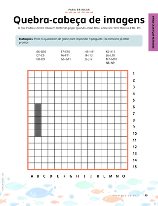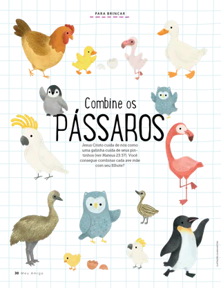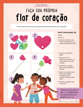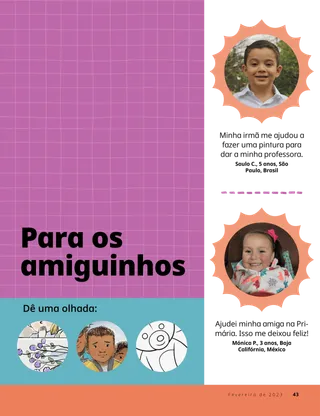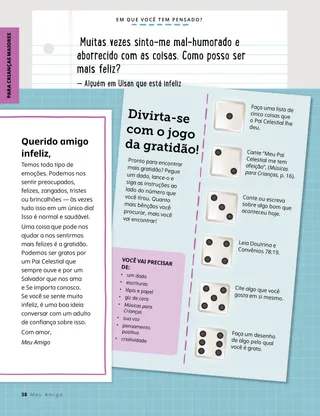 Fevereiro de 2023 Querido amigoLeia uma mensagem sobre como tratar as pessoas com bondade e como lidar com o bullying. Amigos pelo correioLeia algumas cartas de nossos amigos ao redor do mundo! Russell M. NelsonComo ter alegriaLeia uma mensagem do presidente Russell M. Nelson sobre como ter alegria. Ray GoldrupDoze adesivos sorridentesAntônio faz coisas boas para as pessoas depois de ter sido desafiado por sua professora da Primária a fazer as pessoas sorrirem. Vem, e Segue-Me Atividades do Vem, e Segue-MeUse estas atividades e ideias para estudar o Vem, e Segue-Me com sua família. Lançamento de escriturasDivirta-se com um jogo das escrituras! BatismoAprenda sobre seu caminho do convênio que o leva de volta ao Pai Celestial. Maryssa DennisAmigos achados e perdidosQuando Lia perde uma amiga na escola, o Pai Celestial a ajuda. Isaac E.A escolha do futebolIsaac E. conta como escolheu santificar o Dia do Senhor. Encontre!Você consegue encontrar os itens escondidos no desenho? Mikaela WilkinsGrandes históriasBeckham conta algumas pequenas mentiras e aprende que dizer a verdade é a melhor escolha. Seguindo a Jesus na SuéciaConheça Linnéa, Felícia e Cecília, da Suécia, e aprenda como elas seguem Jesus. Saudações da Suécia!Faça uma viagem para aprender sobre a Suécia! Jeffrey R. HollandO que o evangelho ensina sobre o amor?Leia uma mensagem do élder Jeffrey R. Holland sobre como Deus nos ensina a amar. Faça sua própria flor de coraçãoFaça uma obra de arte com temas de coração para compartilhar com alguém. Gayle Kinney-CorneliusAmigos de recreioJason encontra amigos na escola que gostam das mesmas coisas que ele. Posso defender os outrosSaiba como Jesus Cristo defendeu as pessoas e demonstrou bondade. Juntos seguindo a JesusUma coletânea de citações feitas por crianças de todo o mundo. Lucy Stevenson EwellA bagunça dos ovosSasha e Alfred brincam com alguns ovos e fazem uma grande bagunça, mas escolhem ser honestos. Combine os pássarosDivirta-se com um jogo de correspondência para lembrar como Jesus Cristo se importa conosco. Ideia brilhanteUm cartaz com a mensagem: “Quando sigo Jesus Cristo, sinto-me feliz!” Vaiangina SikahemaDeus está lá?Leia uma mensagem do élder Vaiangina Sikahema sobre como ele foi selado à sua família no templo quando criança. Margo e PaoloPaolo está preocupado com sua nova classe da Primária, mas Margo o ajuda a se sentir melhor. Para crianças maiores Para crianças maioresDicas e atividades para as crianças maiores. Juliann Tenney DomanO bilhete felizRiley e seus amigos fazem algo bondoso para ajudar o novo professor a se sentir bem-vindo na escola. Em que você tem pensado?Leia sobre como a gratidão pode ajudá-lo a se sentir mais feliz. Quebra-cabeça de imagensComplete o quebra-cabeça para encontrar a resposta para a pergunta. Zoila Rosa Trelles Araujo,O novo chamado de MarcoMarco é chamado para ser consultor de história da família de sua ala e aprende a fazer o trabalho de história da família. As coisas mais importantesRealize esta atividade para ajudá-lo a escolher as metas para o programa Crianças e Jovens. Para os amiguinhos Para os amiguinhosConheça alguns amiguinhos ao redor do mundo. Posso seguir a Jesus escolhendo o que é certoAprenda como você pode seguir Jesus escolhendo o que é certo. Jesus cura uma mulherLeia uma história sobre como Jesus curou uma mulher. Tenho fé em Jesus CristoEnsine seus filhos pequenos sobre o evangelho utilizando uma página para colorir. Neste mês, a mensagem é “Tenho fé em Jesus Cristo”. Atividades do Vem, e Segue-Me para os amiguinhosUse estas atividades para estudar o Vem, e Segue-Me com seus filhos menores. Queridos paisLeia uma mensagem sobre como encontrar paz em Cristo.