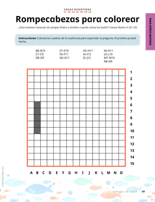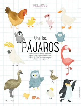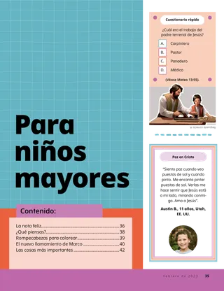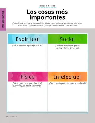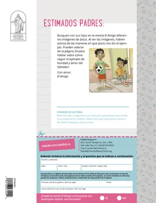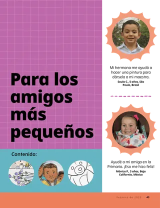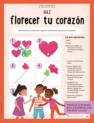 Febrero de 2023 Queridos amigosLee un mensaje acerca de tratar a las personas con amabilidad y de lidiar con el acoso o bullying. Amigos por correo¡Lee cartas de nuestros amigos de todo el mundo! Russell M. NelsonCómo hallar gozoLee el mensaje del presidente Russell M. Nelson sobre cómo hallar gozo. Ray GoldrupDoce pegatinas sonrientesAntonio hace cosas amables por otras personas después de que la maestra de la Primaria lo invitó a hacer sonreír a las personas. Ven, sígueme Actividades de Ven, síguemeUtiliza estas actividades para estudiar Ven, sígueme con tu familia. Lanzamiento en las Escrituras¡Participa en un divertido juego de las Escrituras! BautismoAprende acerca de tu senda de los convenios de regreso al Padre Celestial. Maryssa DennisAmigos perdidos y encontradosEl Padre Celestial ayuda a Leah cuando pierde una amiga en la escuela. Isaac E.La decisión del fútbolIsaac E. cuenta cómo escogió santificar el día de reposo. ¡Encuéntralos!¿Puedes encontrar los objetos escondidos en la ilustración? Mikaela WilkinsGrandes historiasBeckham dice algunas pequeñas mentiras y aprende que decir la verdad es la mejor opción. Seguir a Jesús en SueciaConoce a Linnéa, Felicia y Cecilia, de Suecia, y aprende cómo siguen a Jesús. ¡Hola desde Suecia!¡Haz un viaje para aprender acerca de Suecia! Jeffrey R. Holland¿Qué enseña el Evangelio sobre el amor?Lee el mensaje del élder Jeffrey R. Holland acerca de cómo Dios nos enseña a amar. Haz florecer tu corazónHaz una manualidad centrada en el corazón para compartir con alguien. Gayle Kinney-CorneliusAmigos en el recreoJason encuentra amigos en la escuela a los que les agradan las mismas cosas que a él. Puedo defender a otras personasAprende acerca de cómo Jesucristo defendió a los demás y demostró bondad. Seguir juntos a JesúsUna recopilación de comentarios de niños de todo el mundo. Lucy Stevenson EwellEl desastre de los huevosSasha y Alfred juegan con algunos huevos y hacen un desastre, pero deciden ser sinceros. Une los pájarosJuega uniendo los pájaros para recordar cómo Jesucristo se preocupa por nosotros. Una idea brillanteUn póster con el mensaje: “Cuando sigo a Jesucristo, ¡soy feliz!” Vaiangina Sikahema¿Está Dios allí?Lee un mensaje del élder Vaiangina Sikahema sobre cómo fue sellado a su familia en el templo cuando era niño. Margo y PaoloPaolo está nervioso por ir a su nueva clase de la Primaria, pero Margo lo ayuda a sentirse mejor. Para niños mayores Para niños mayoresSugerencias y actividades para niños mayores. Juliann Tenney DomanLa nota felizRiley y sus amigos hacen algo amable por su nuevo maestro para ayudarlo a sentirse bienvenido en la escuela. ¿Qué piensas?Lee acerca de cómo la gratitud puede ayudarte a sentirte más feliz. Rompecabezas para colorearTermina el rompecabezas para encontrar la respuesta a la pregunta. Zoila Rosa Trelles AraujoEl nuevo llamamiento de MarcoMarco es llamado a ser consultor de historia familiar en su barrio y aprende cómo hacer la obra de historia familiar. Las cosas más importantesHaz esta actividad para ayudarte a fijar metas del programa Niños y Jóvenes. Para los amigos más pequeños Para los amigos más pequeñosConoce a algunos amiguitos de todo el mundo. Puedo seguir a Jesús al hacer lo justoAprende cómo puedes seguir a Jesús al hacer lo justo. Jesús sana a una mujerLee un relato sobre cómo Jesús sanó a una mujer. Tengo fe en JesucristoEnseñe a sus pequeños con una página para colorear centrada en el Evangelio. El mensaje de este mes es: “Tengo fe en Jesucristo”. Actividades de Ven, sígueme para los más pequeñosUtilice estas actividades para estudiar Ven, sígueme con sus pequeños. Estimados padresLea un mensaje para los padres sobre cómo hallar paz en Jesucristo.