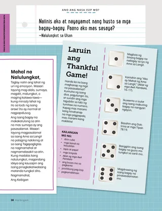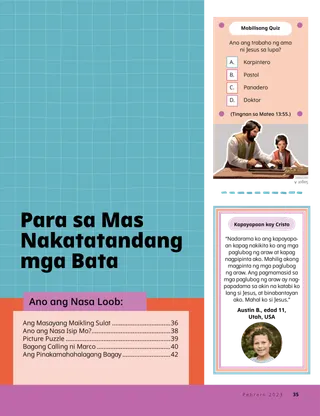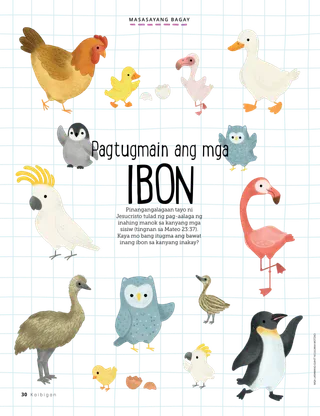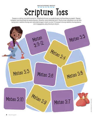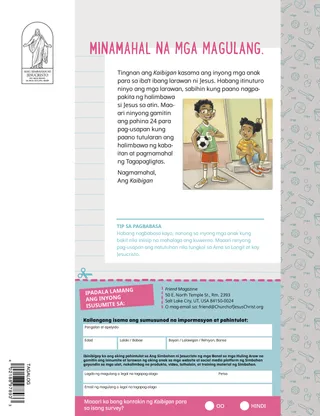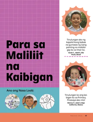 Pebrero 2023 Minamahal na mga KaibiganBasahin ang isang mensahe tungkol sa kabaitan sa mga tao at sa pagharap sa pambu-bully. Mga Kaibigan sa KoreoBasahin ang ilang sulat mula sa ating mga kaibigan sa buong mundo! Russell M. NelsonPaano Magkaroon ng KagalakanBasahin ang isang mensahe mula kay Pangulong Russell M. Nelson kung paano magkaroon ng kagalakan. Ray GoldrupLabindalawang Smiley StickerNagpakita ng kabaitan si Antonio sa mga tao matapos silang hamunin ng Primary teacher niya na pangitiin ang mga tao. Pumarito Ka, Sumunod Ka sa Akin Mga Aktibidad para sa Pumarito Ka, Sumunod Ka sa AkinGamitin ang mga aktibidad na ito para pag-aralan ang Pumarito Ka, Sumunod Ka sa Akin kasama ang iyong pamilya. Scripture TossMaglaro ng isang masayang laro tungkol sa banal na kasulatan! BinyagAlamin tungkol sa iyong landas ng tipan pabalik sa Ama sa Langit. Maryssa DennisMga Kaibigang Nawala at NatagpuanNang mawalan ng kaibigan si Leah sa paaralan, tinulungan siya ng Ama sa Langit. Isaac E.Ang Pagpili sa SoccerIkinuwento ni Isaac E. kung paano niya piniling panatilihing banal ang araw ng Sabbath. Hanapin Ito!Mahahanap mo ba ang mga item na nakatago sa larawan? Mikaela WilkinsMalalaking KuwentoNagsabi ng ilang maliliit na kasinungalingan si Beckham at nalaman niya na ang pagsasabi ng totoo ang pinakamagandang piliin. Pagsunod kay Jesus sa SwedenKilalanin sina Linnéa, Felicia, at Cecilia mula sa Sweden at alamin kung paano nila sinusunod si Jesus. Hello mula sa Sweden!Maglakbay para malaman ang tungkol sa Sweden! Jeffrey R. HollandAno ang Itinuturo ng Ebanghelyo tungkol sa Pagmamahal?Basahin ang isang mensahe mula kay Elder Jeffrey R. Holland kung paano tayo tinuturuan ng Diyos na magmahal. Gumawa ng Sarili Mong Bulaklak na PusoGumawa ng craft na may temang puso para ibigay sa isang tao. Gayle Kinney-CorneliusMagkakaibigan Tuwing RecessNagkaroon si Jason ng mga kaibigan sa paaralan na gusto rin ang mga bagay na gusto niya. Kaya Kong Manindigan para sa IbaAlamin kung paano nanindigan para sa iba at nagpakita ng kabaitan si Jesucristo. Magkakasamang Sumusunod kay JesusIsang koleksyon ng mga sipi mula sa mga bata sa iba’t ibang panig ng mundo. Lucy Stevenson EwellAng Nagkalat na mga Basag na ItlogNilaro nina Sasha at Alfred ang ilang itlog at hindi nila iyon nasalo, pero pinili nilang maging matapat. Pagtugmain ang mga IbonMaglaro ng pagtutugma para maalala kung paano tayo pinangangalagaan ni Jesucristo. Magandang IdeyaIsang poster na may mensaheng, “Kapag sinusunod ko si Jesucristo, masaya ako!” Vaiangina SikahemaNaroon ba ang Diyos?Basahin ang isang mensahe mula kay Elder Vaiangina Sikahema kung paano siya nabuklod sa kanyang pamilya sa templo noong bata pa siya. Margo at PaoloKabado si Paolo sa pagpunta sa bago nilang klase sa Primary, pero pinagaan ni Margo ang pakiramdam niya. Para sa Mas Nakatatandang mga Bata Para sa Mas Nakatatandang mga BataMga tip at aktibidad para sa mas nakatatandang mga bata. Juliann Tenney DomanAng Masayang Maikling SulatGumawa ng kabutihan si Riley at ang kanyang mga kaibigan para sa bago nilang guro para maipadama rito na tanggap siya sa paaralan. Ano ang Nasa Isip Mo?Basahin kung paano makakatulong sa iyo ang pasasalamat para mas sumaya ka. Picture PuzzleTapusin ang puzzle para mahanap ang sagot sa tanong. Zoila Rosa Trelles AraujoBagong Calling ni MarcoSi Marco ay tinawag na maging family history consultant sa kanyang ward at natuto kung paano gumawa ng family history. Ang Pinakamahahalagang BagayGawin ang aktibidad na ito para matulungan kang gumawa ng mga mithiin para sa programang Mga Bata at Kabataan. Para sa Maliliit na Kaibigan Para sa Maliliit na KaibiganKilalanin ang ilang maliliit na kaibigan mula sa iba’t ibang panig ng mundo. Masusunod Ko si Jesus sa Pagpili ng TamaAlamin kung paano mo masusunod si Jesus sa pagpili ng tama. Pinagaling ni Jesus ang Isang BabaeBasahin ang kuwento kung paano pinagaling ni Jesus ang isang babae. Nananampalataya Ako kay JesucristoTuruan ang inyong mga musmos gamit ang isang pahinang kukulayan na nakasentro sa ebanghelyo. Ang mensahe sa buwang ito ay, “Nananampalataya ako kay Jesucristo.” Pumarito Ka, Sumunod Ka sa Akin para sa Maliliit na BataGamitin ang mga ideyang ito sa pag-aaral ng Pumarito Ka, Sumunod Ka sa Akin kasama ang inyong mga musmos. Minamahal na mga MagulangBasahin ang isang mensahe para sa mga magulang tungkol sa pagkakaroon ng kapayapaan kay Cristo.